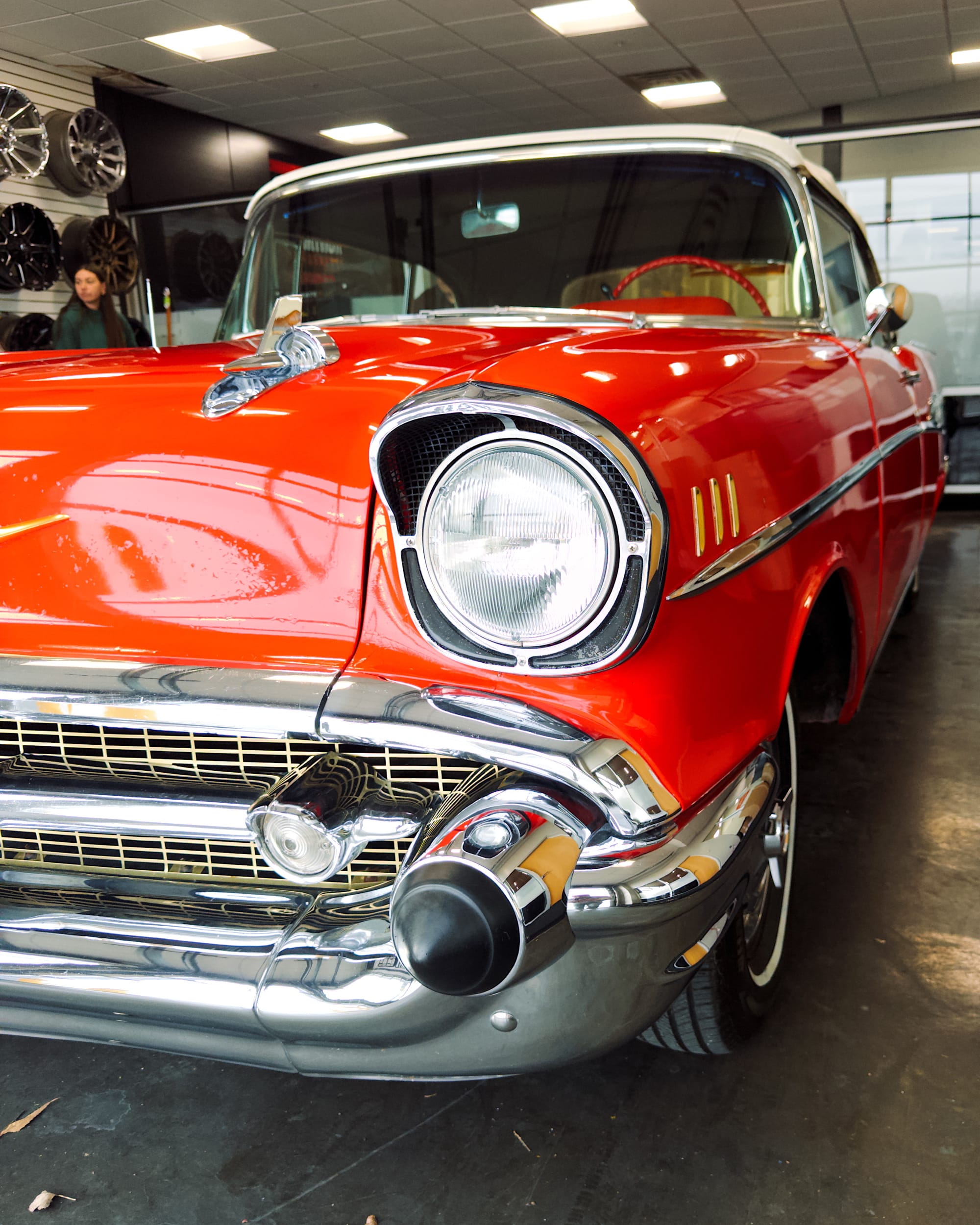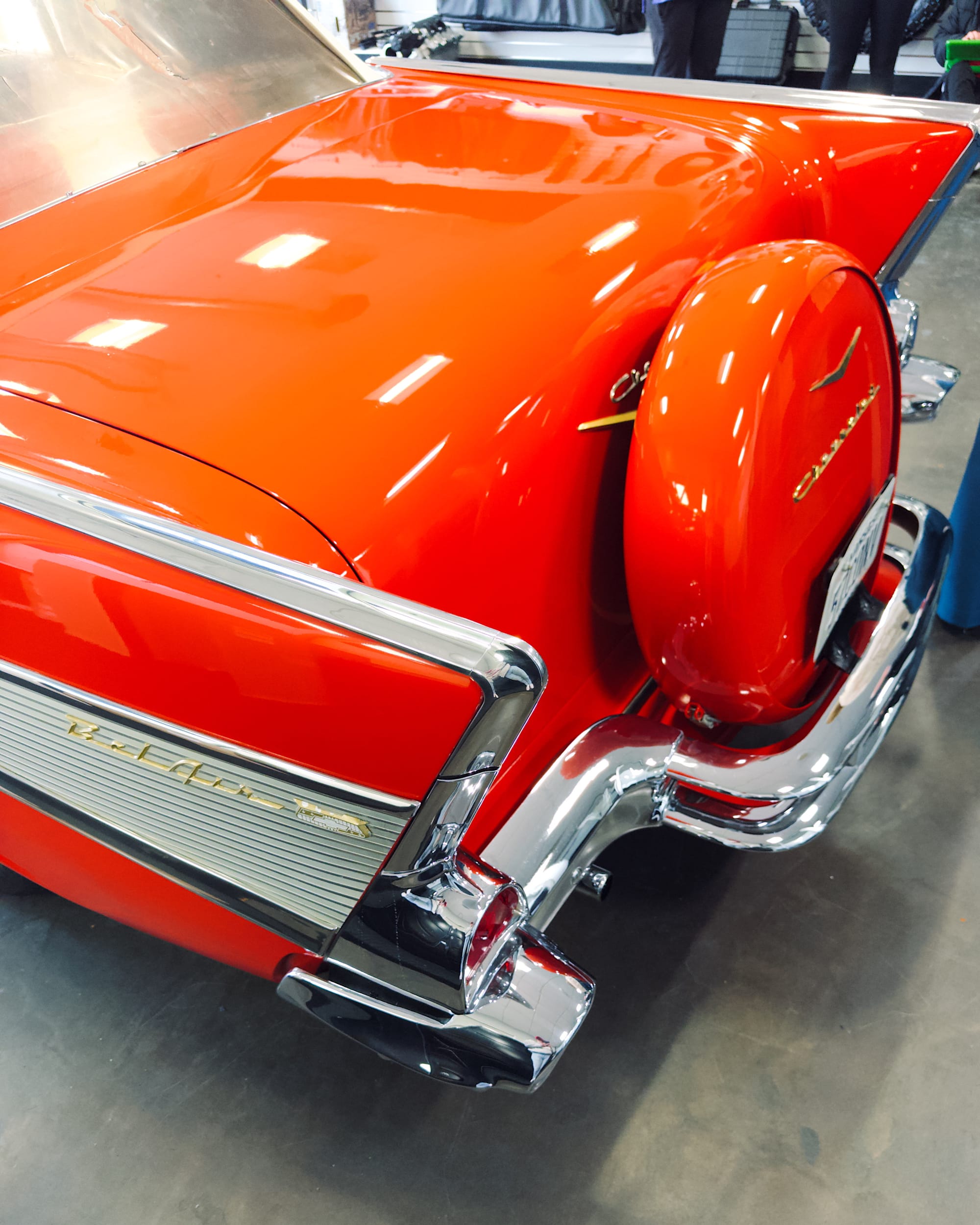 The Bel Air was refurbished earlier in its life, including a repaint in red and a re-trim of the interior in red and silver upholstery. Power comes from a 283 cubic-inch Turbo-Fire V8 paired with a two-speed automatic transmission. Equipment includes a power-operated white convertible top, Continental kit, chrome bumpers, drum brakes, a cabin heater, AM radio, and a split-folding front bench seat.