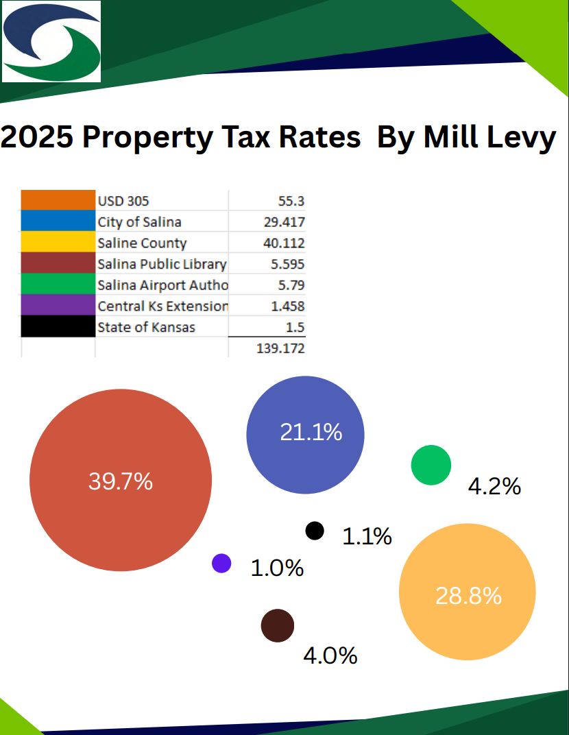 SALINA, Kan. — Property owners in Salina saw their 2025 tax bills reflect rates from several local and state entities, totaling a combined mill levy of 139.172. Each taxing body receives a portion of the total, which is applied to a property’s assessed value to determine the tax amount owed.