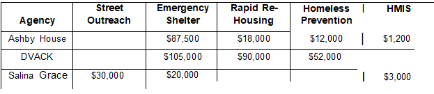 This year, agencies who have submitted applications to provide qualified services related to ESG funding are Ashby House Ltd., the Domestic Violence Association of Central Kansas (DVACK), and Salina Grace. A total of $418,700 will be requested in the application, with each agency requesting the following amounts: