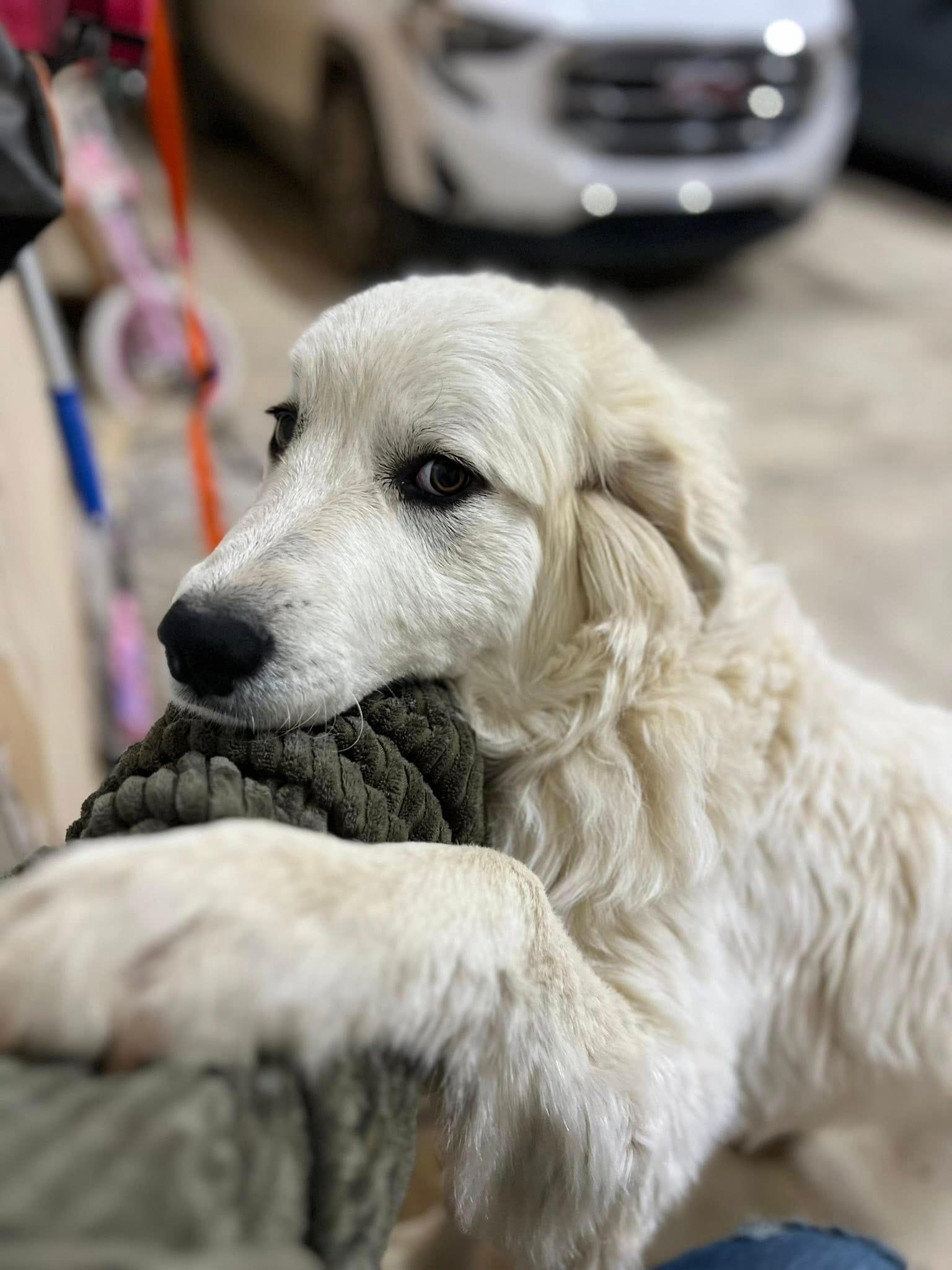 Sienna is a one-year-old, unspayed female with long white fur, dark facial markings, and a slightly curved tail. She is not microchipped. Her collar is marked with a mountain design, and she has visible dewclaws. According to her owners, Sienna also occasionally limps when not on her medication due to bone growth complications.