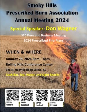 The Smoky Hills Prescribed Burn Association (SHPBA) Annual Meeting is January 29th at Rolling Hills Zoo conference center (in Hedville, Kansas) with doors open at 6 pm for refreshments and social time with music by Don Wagner and his accompanist. Come to the SHPBA Annual Meeting to learn about proper fire management. The meeting provides an opportunity to socialize with like minded landowners and to learn more about the SHPBA cooperative. The business meeting will begin at 6:30 pm with the opening by the Director, the financial report by the Treasurer, and followed by our speakers. The first speaker will be Kristin Kloft, Ladysmith Consulting LLC, discussing burn plans and fire methodology. The new NRCS Manhattan area range conservationist will discuss the latest information on the NRCS Grazing Lands Conservation Initiative. The night’s special guest speaker is Don Wagner providing his experience using prescribed burning in controlling invasive species. Don Wagner is a local landowner and entertainer who has a variety of talents including a TED Talk on ‘The Invasion of the Water Snatchers’ which can be found on the Smoky Hills PBA Facebook page. Local contractors “Turner’s Pasture Clearing and Tree Mulching” and “Fire for Hire” (among others) will also be attending. “Fighting Fire with Fire” is the new slogan being seen with the significant increase in the number of Prescribed Burn Associations nationwide. Proper fire management reduces fuel loads that encourage wildfires. Prescribed burning reduces excess grass thatch, improves grass health, and kills invasive cedars. The SHPBA is a landowner cooperative begun in 2022 to serve the landowners in Saline and surrounding counties. Eastern red cedar encroachment is an epidemic in the Kansas prairie and prescribed burns are the safest and most economical method of removing cedar trees and other invasive species. The SHPBA serves landowners with manpower, equipment, and expertise to reduce the concerns, fear, and liability of prescribed burns. Prescribed burning is conducted throughout the year based on the landowner’s objectives. Join us on January 29th from 6 to 8 pm for refreshments, to meet some new friends, reconnect with old friends, join the Smoky Hills PBA, and let's all start “Fighting Fire with Fire”.