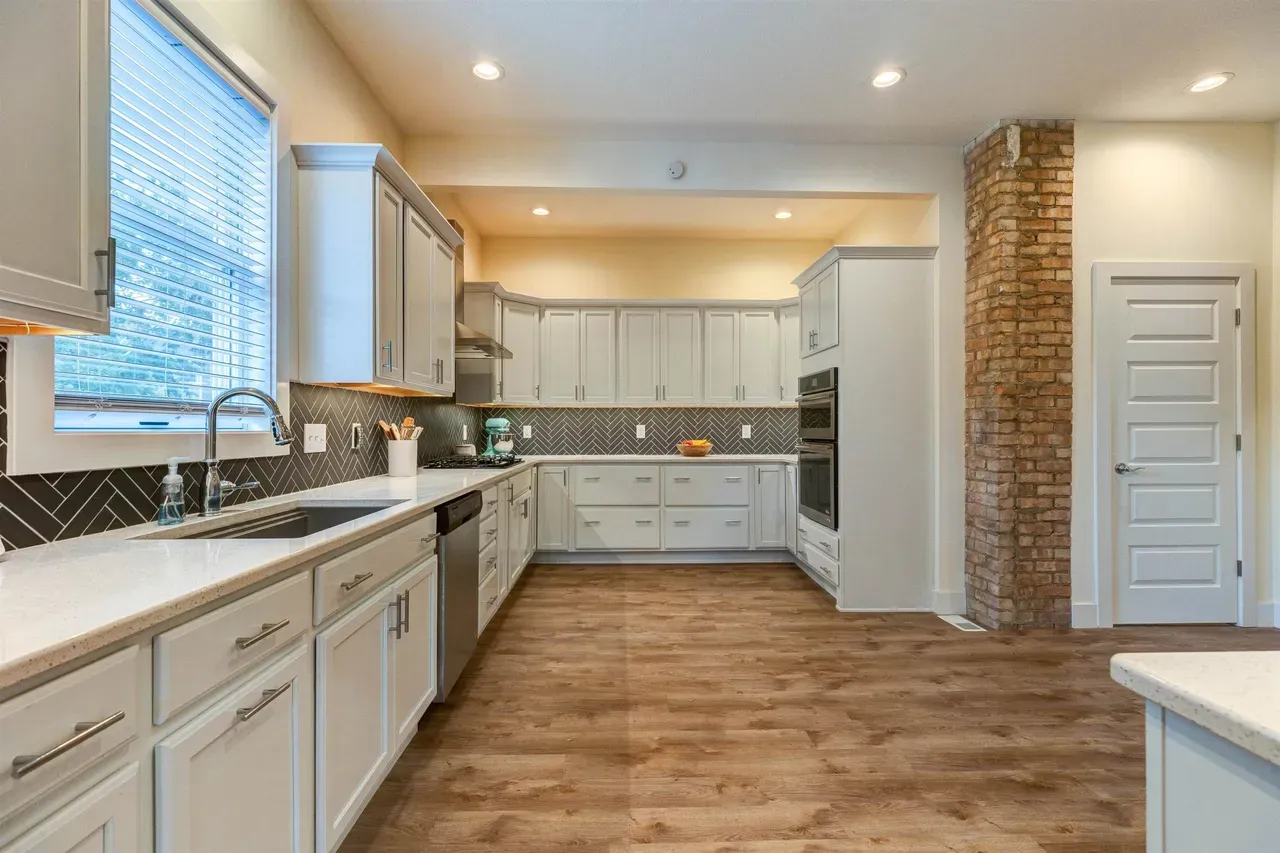 - Chef’s Kitchen: Gas range, wall oven, convection microwave, farmhouse sink, walk-in pantry, built-in desk, and original exposed brick accents.