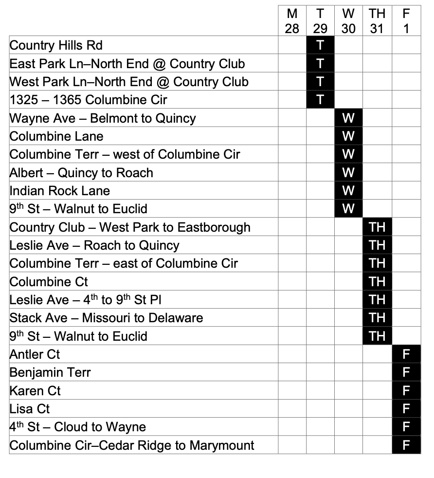 Starting Tuesday, July 29th through Friday, August 1st, Vance Brothers of Kansas City, Missouri will resurface the following City of Salina streets, weather permitting: