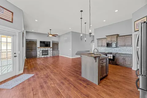 - Custom kitchen with granite island, newer appliances, and ample cabinetry