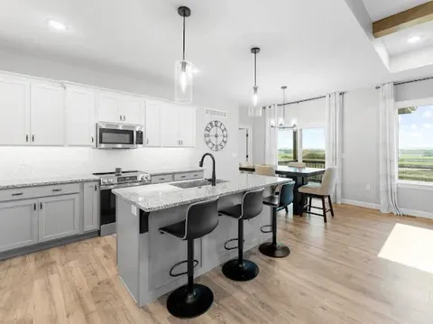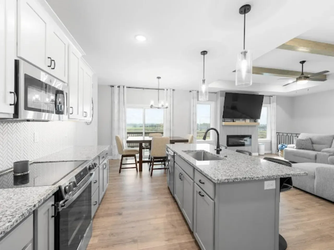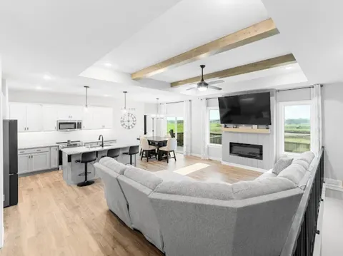The open floor plan includes electric fireplaces on both the main level and in the finished basement, providing warmth and comfort. Custom closet shelving is found throughout the home. The kitchen features stainless steel GE appliances, quartz countertops, an eat-in center island with storage, under-cabinet lighting, dual-tone custom cabinetry, mosaic backsplash, and specialty lighting. A formal dining room adds additional space for gatherings.