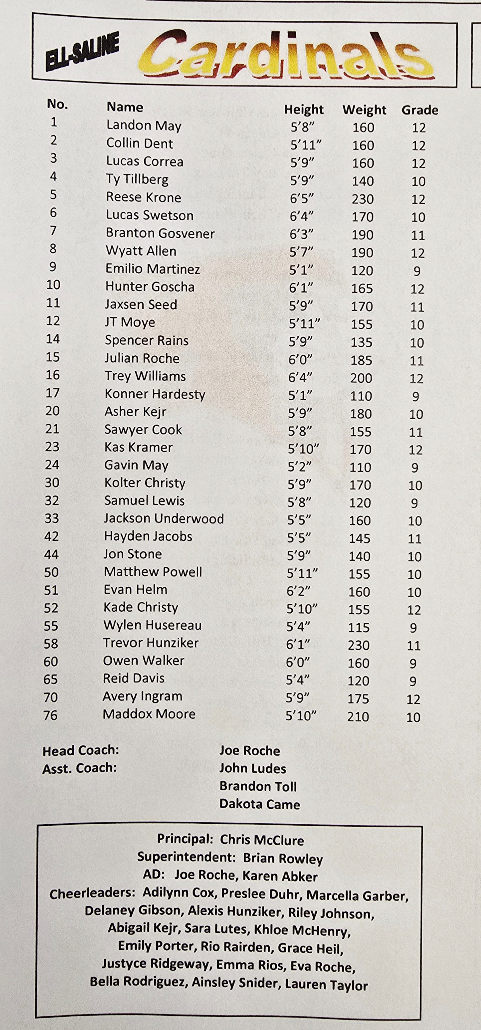 Brookville, KS- October 30, 2025, Washington Co. traveled to Ell-Saline for the first game of the playoffs for 8-Man D1, following the regular season games. Ell-Saline took an early lead and never looked back. The Cardinals held on to a 56-0 score, with the game being called at the half time mark.