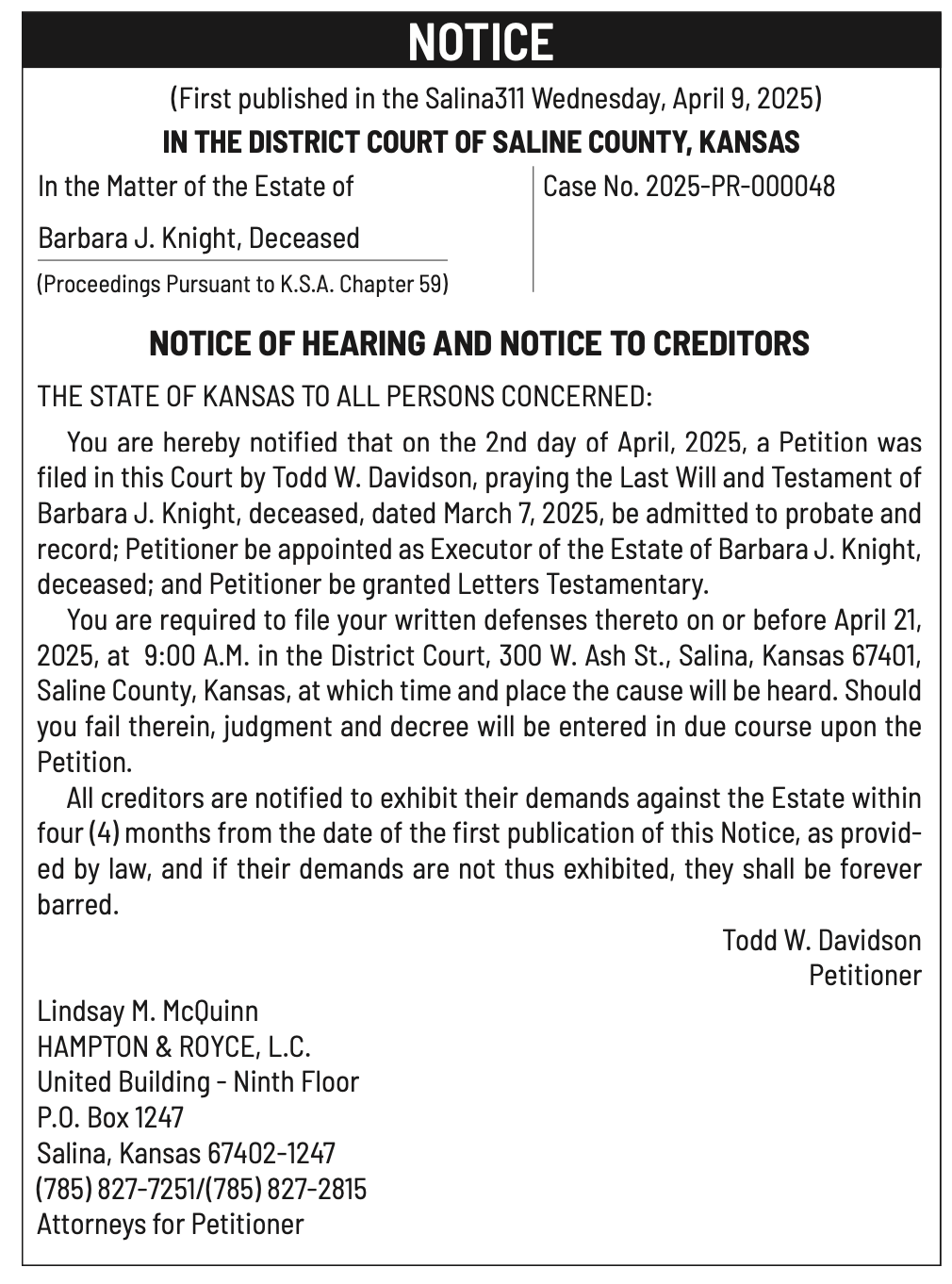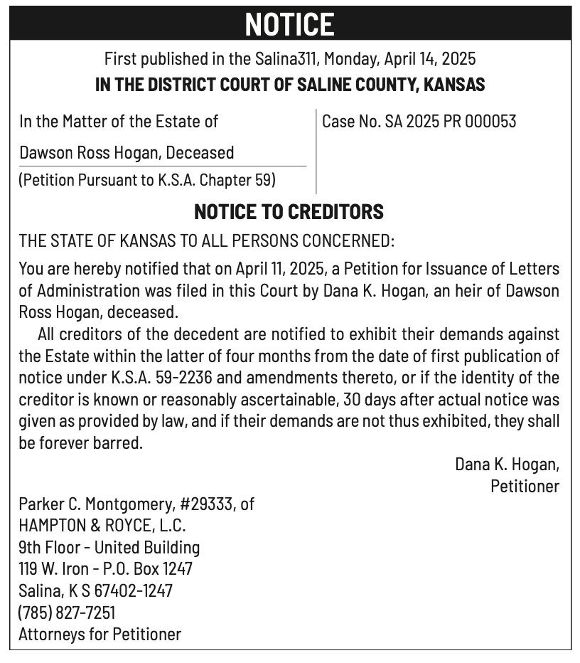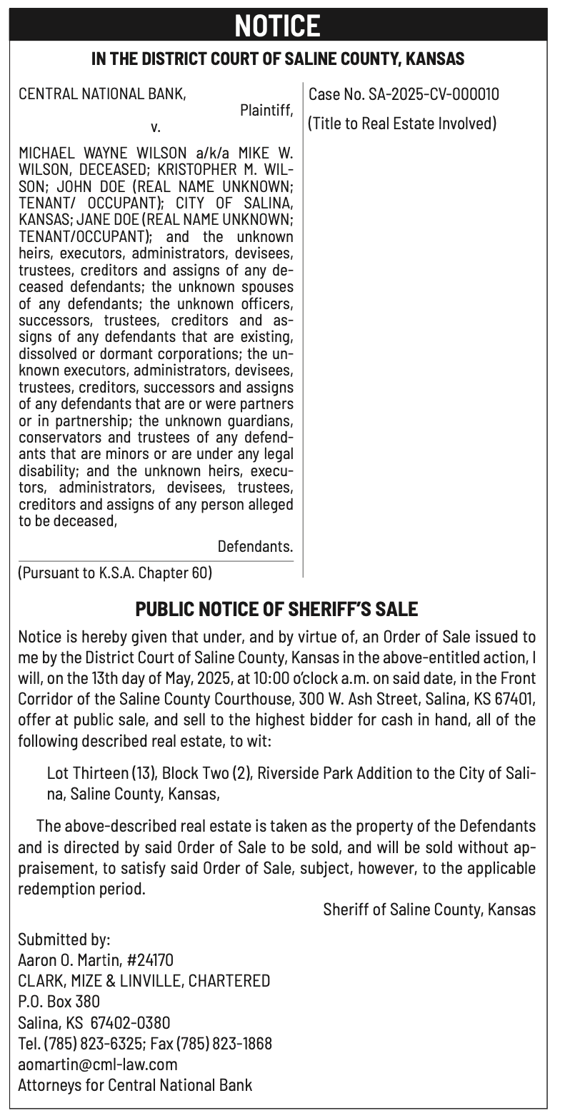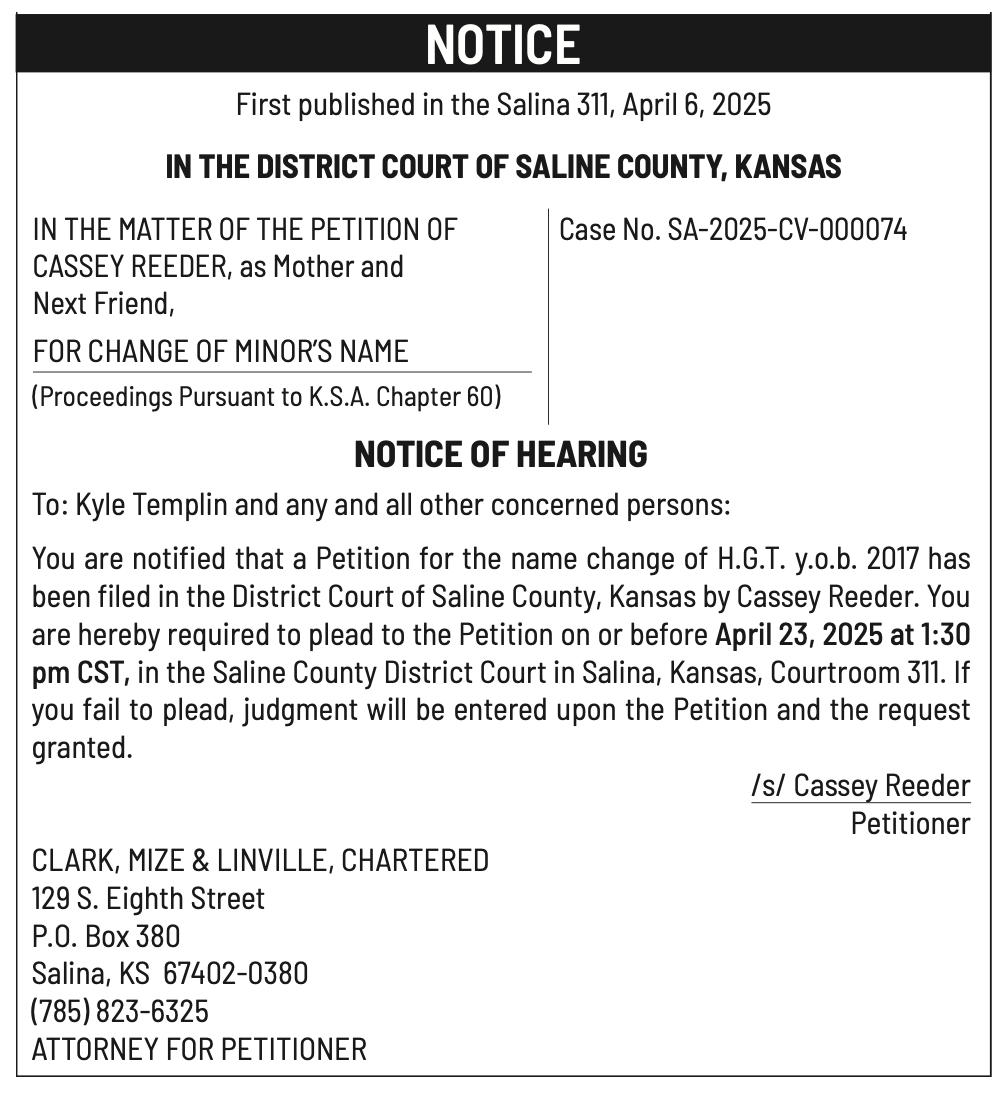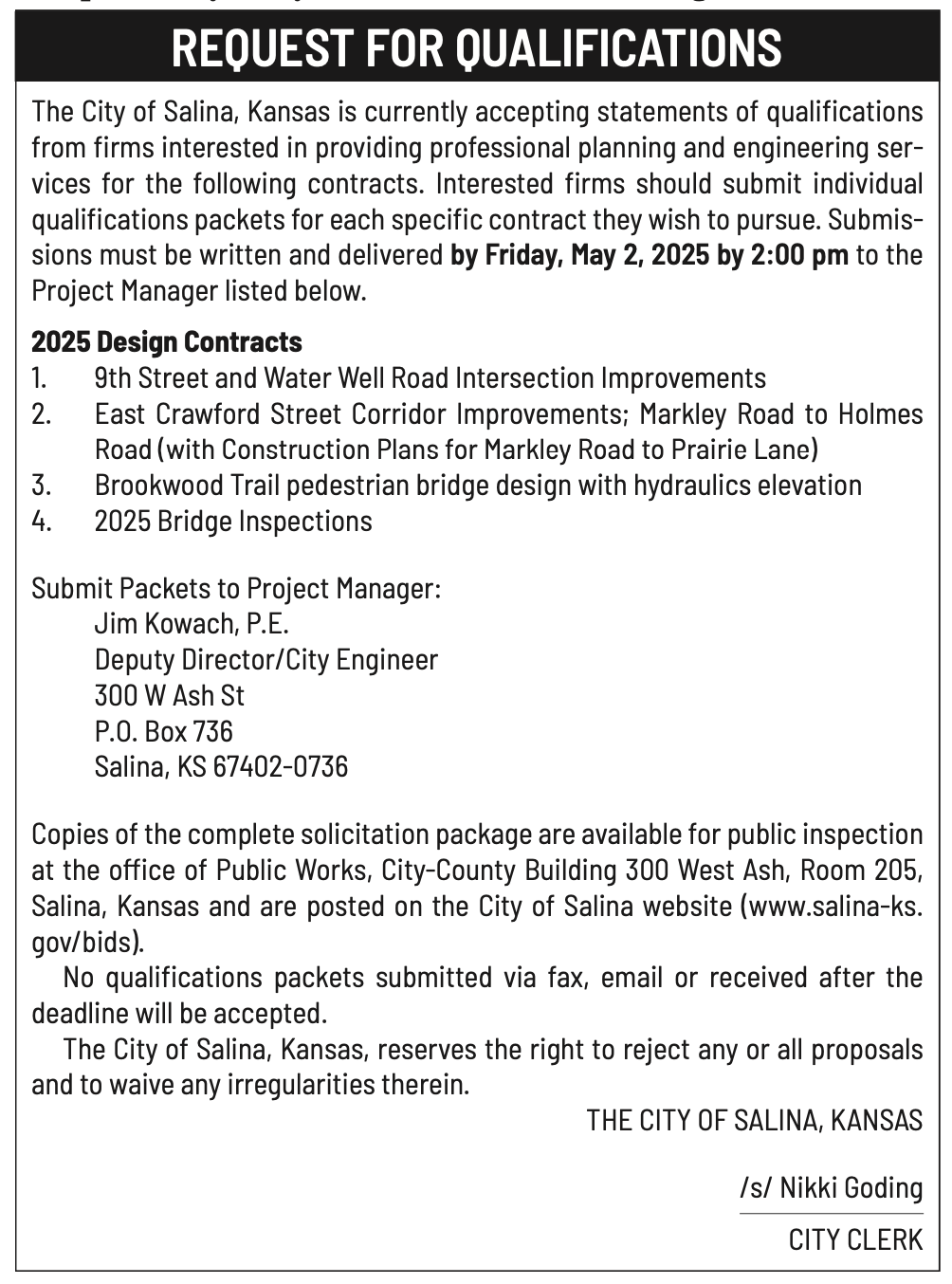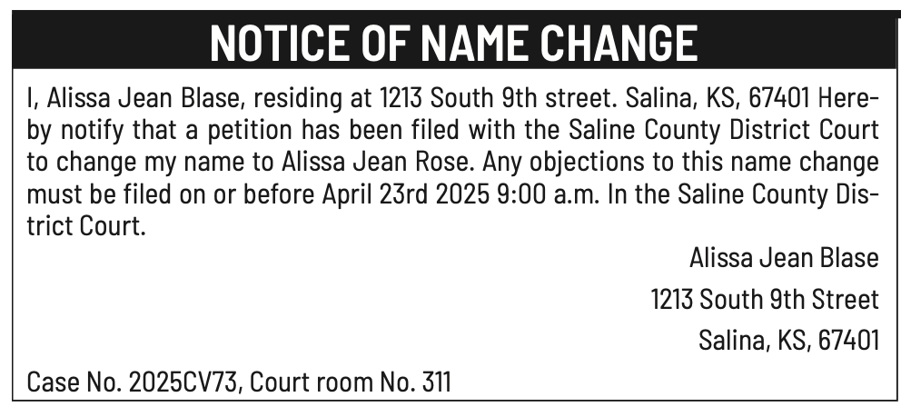 Public notices published in the Salina311 Newspaper on April 20 and/or April 16.๐กThis story was featured in the Salina311 Newspaper. Subscribe To The Paper