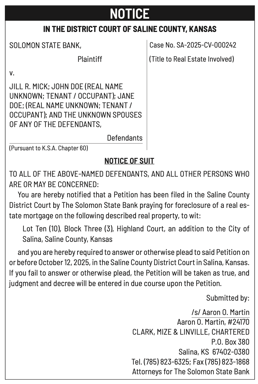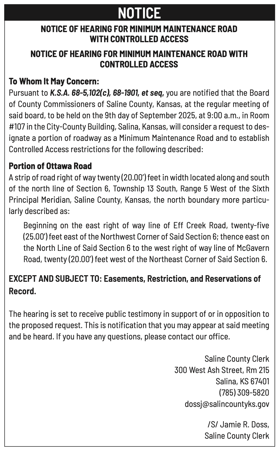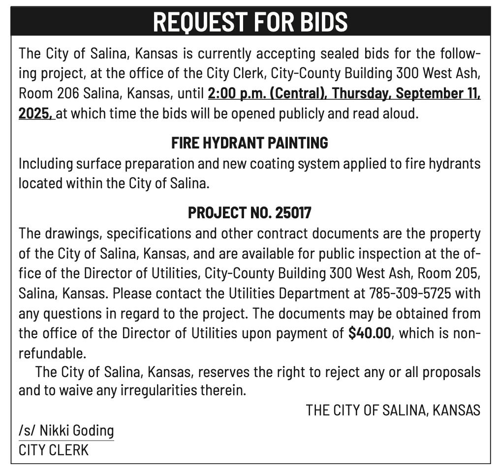 Public notices published in the Salina311 Newspaper on August 31, 2025.π‘This story was featured in the Salina311 Newspaper. Subscribe To The Paper