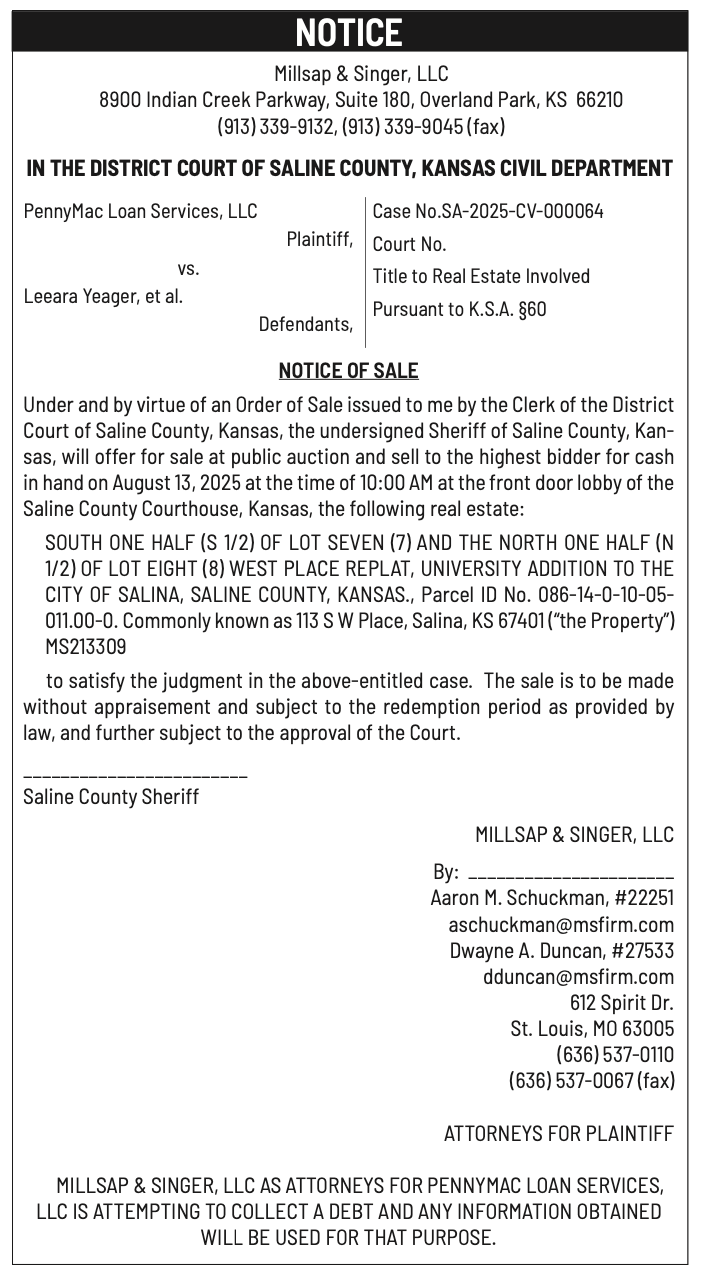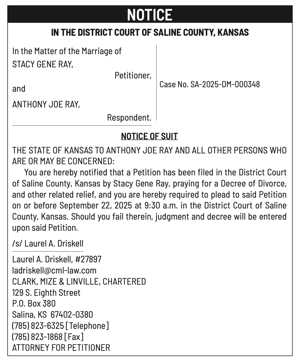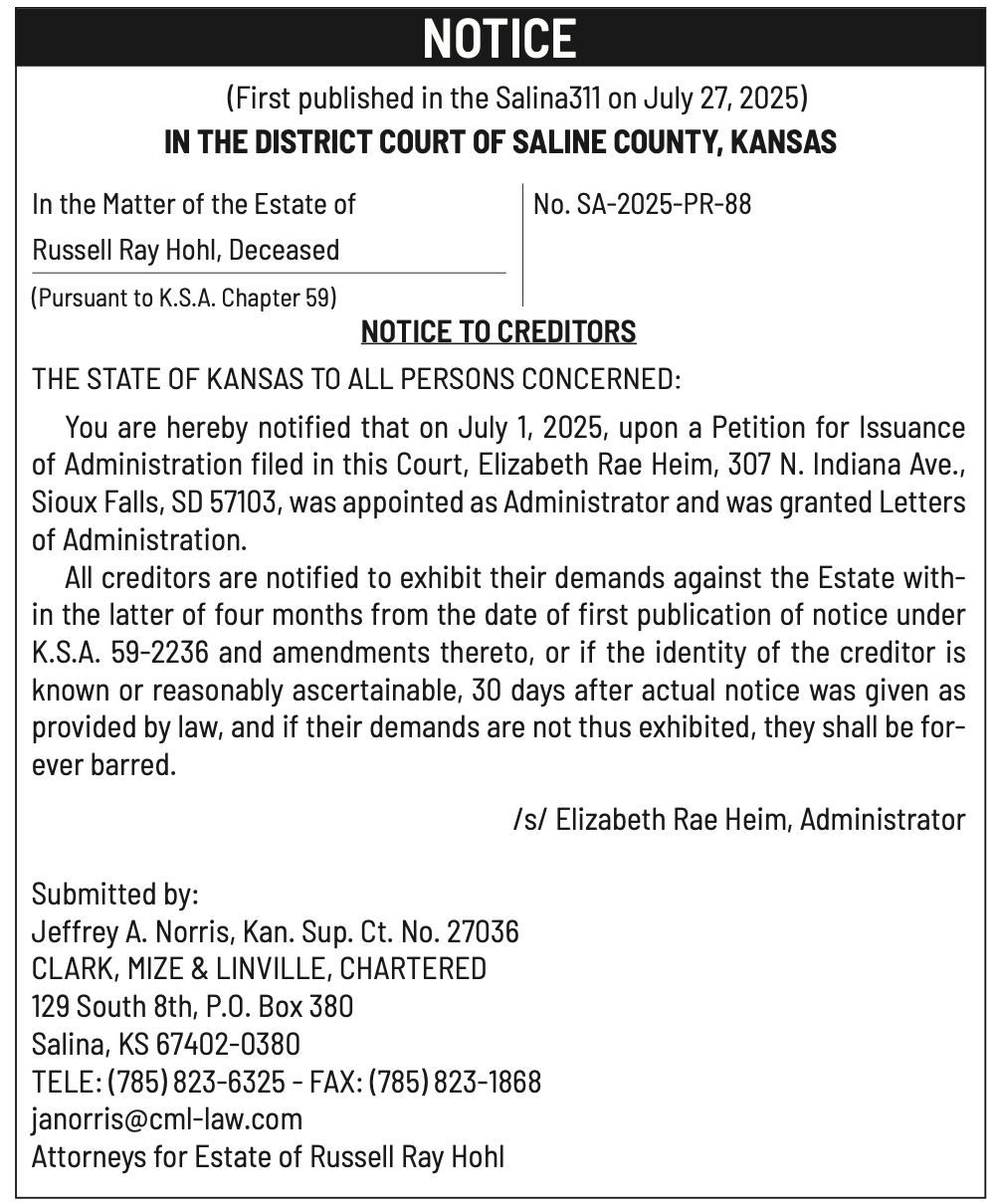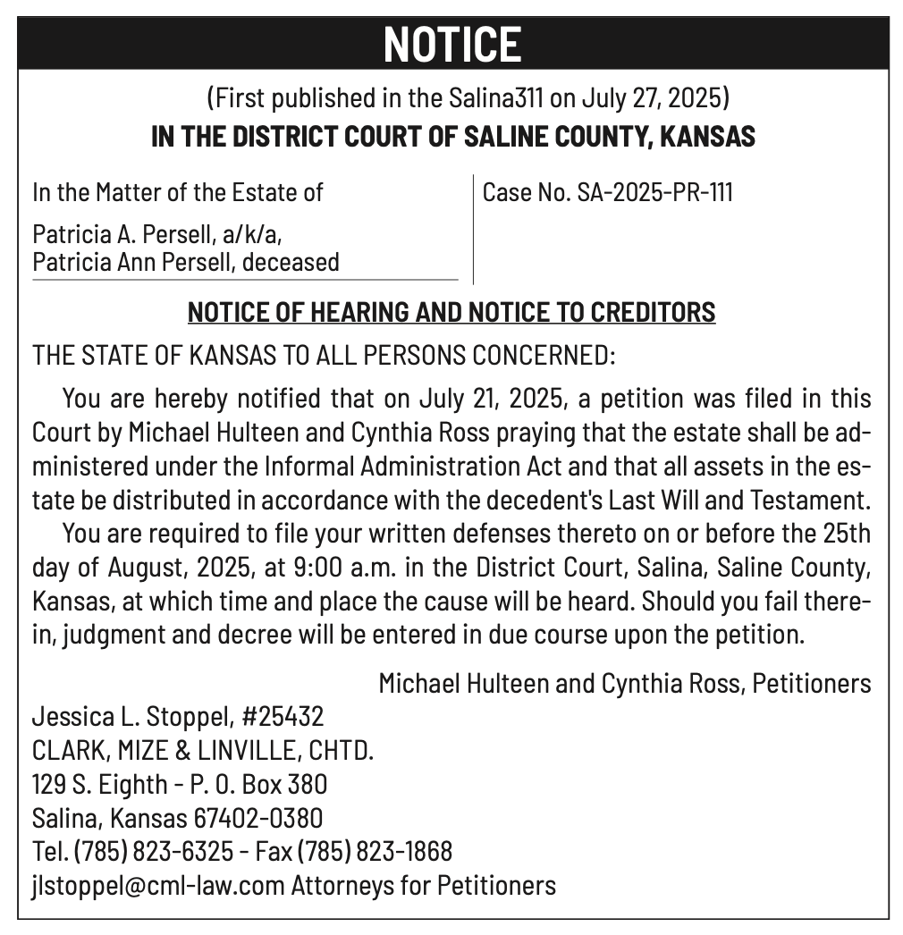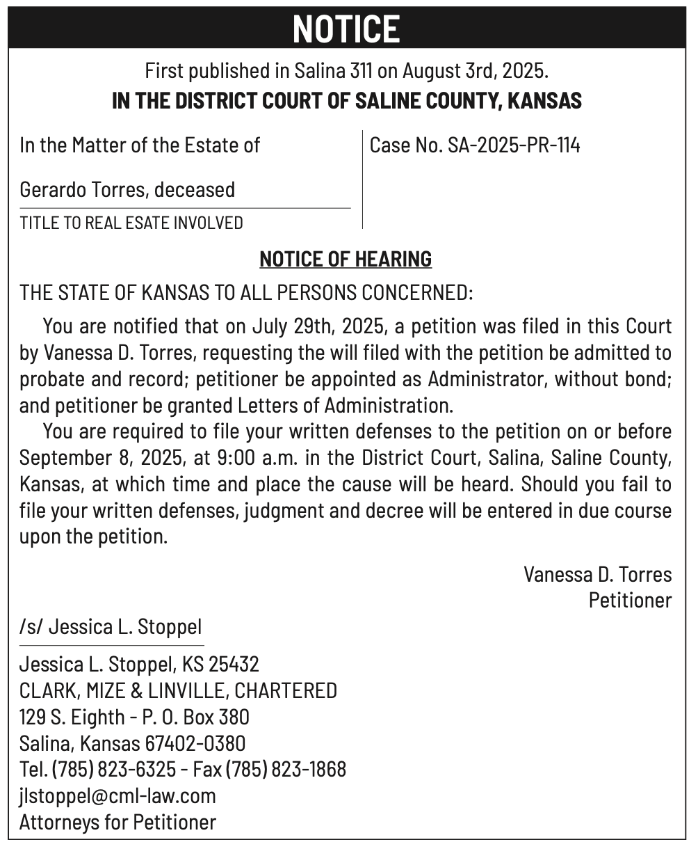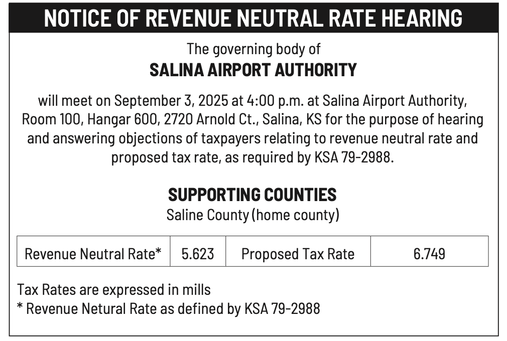 Public notices published in the Salina311 Newspaper on August 3rd and/or July 30th.