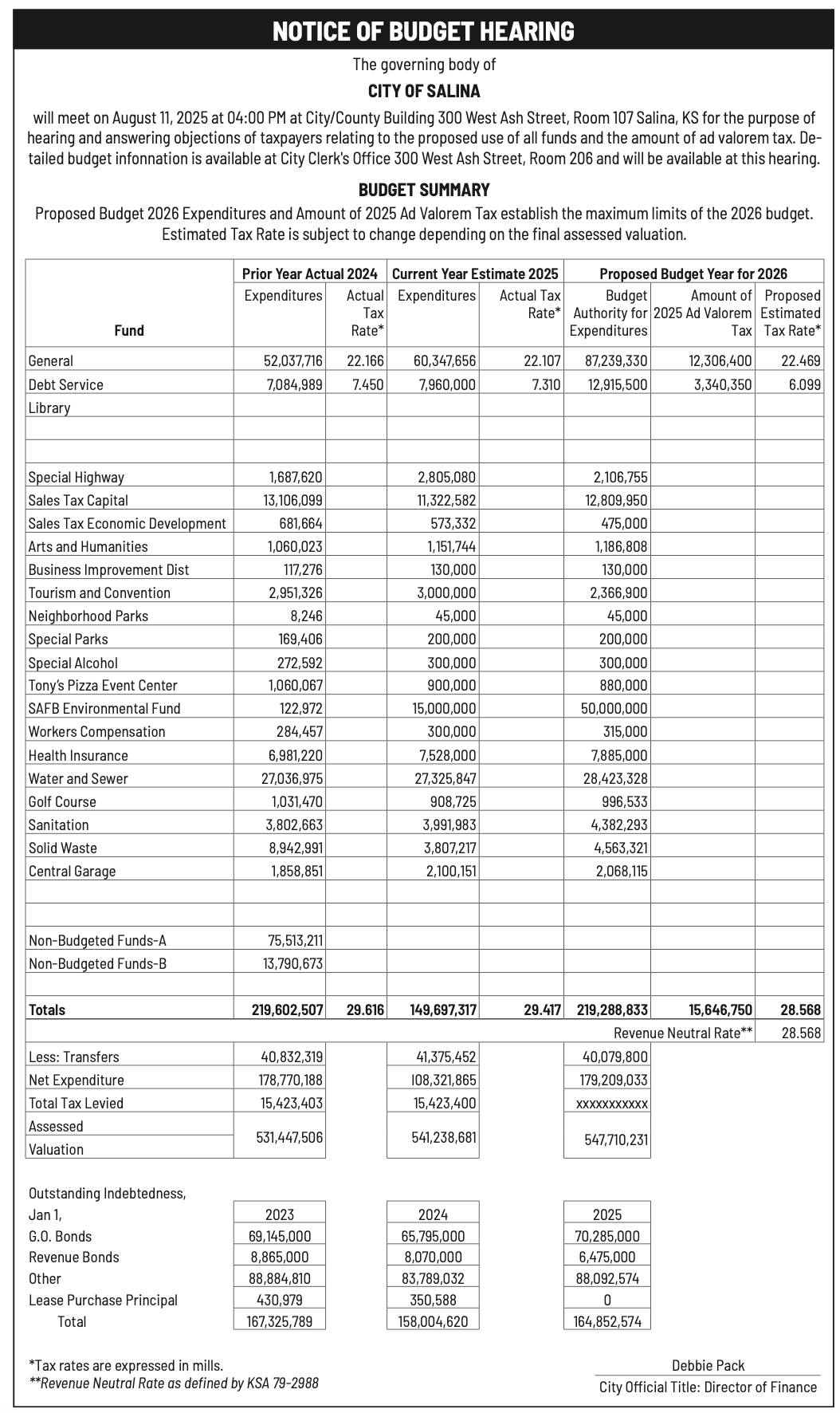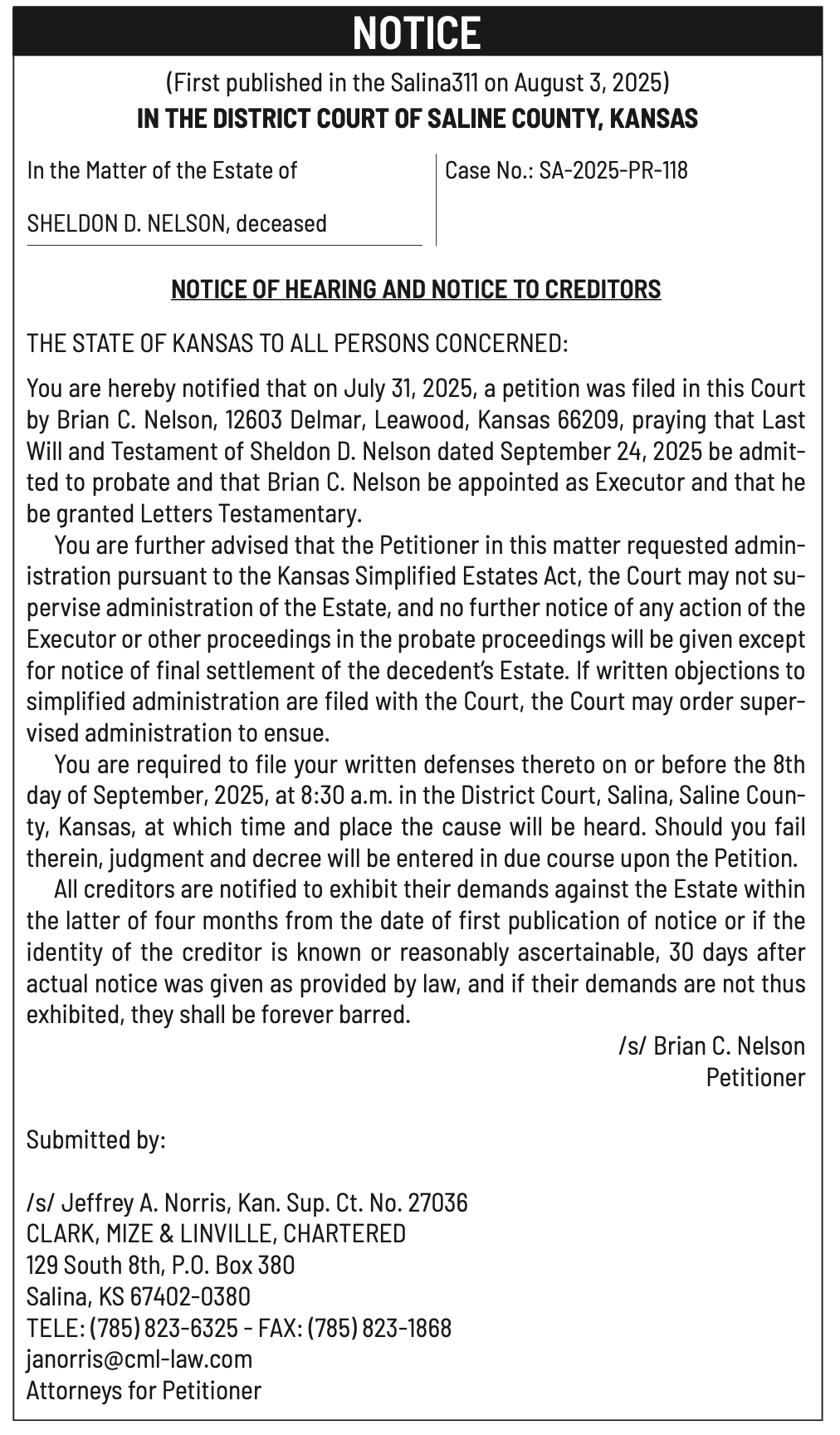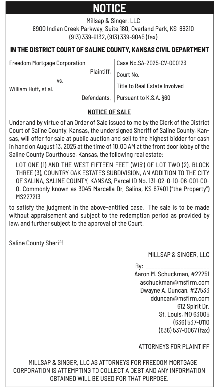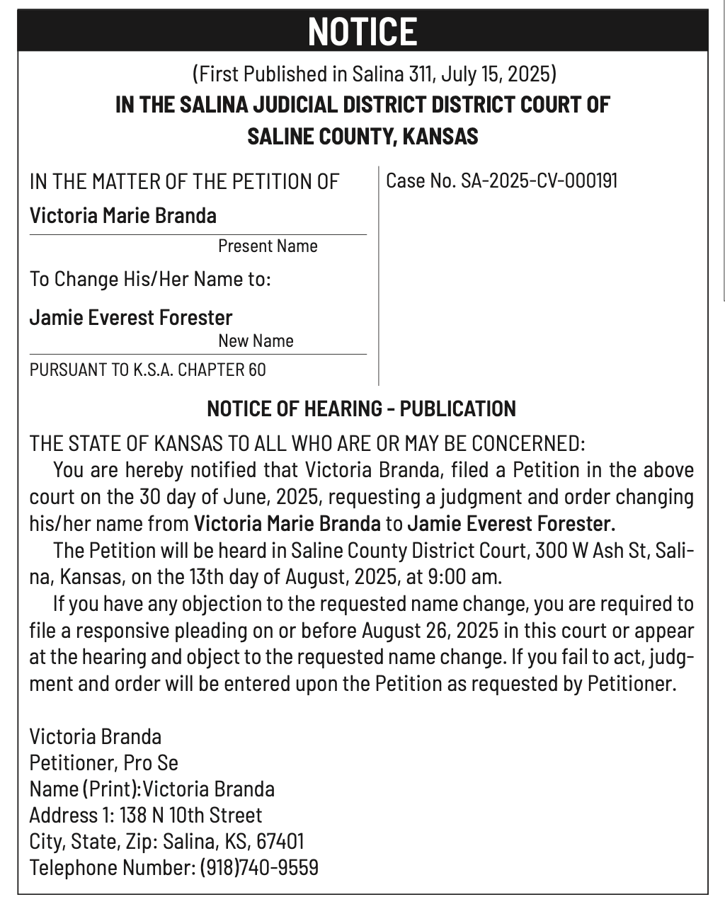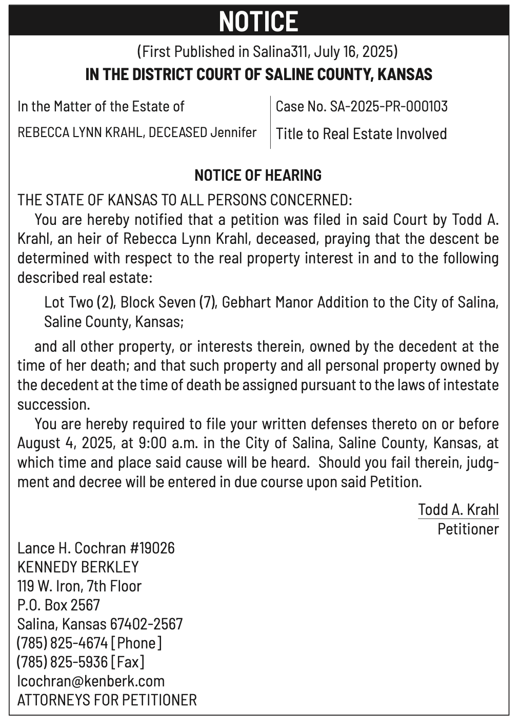 Public notices published in the Salina311 Newspaper on August 3rd and/or July 30th.