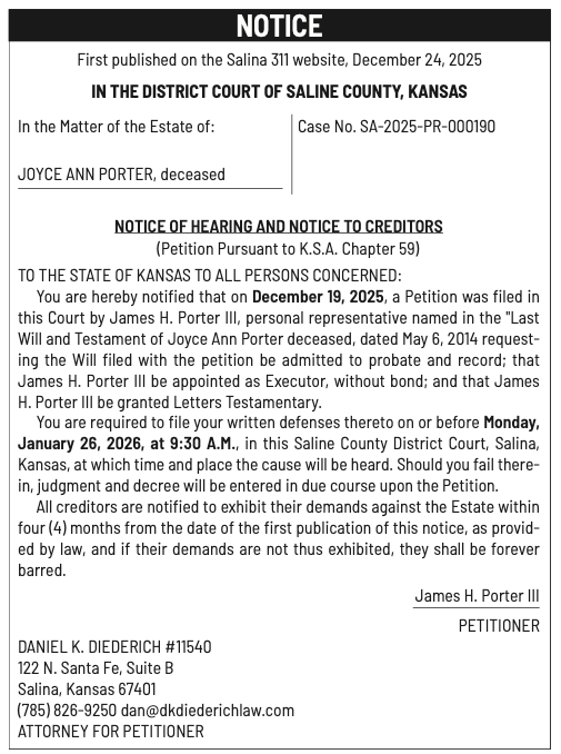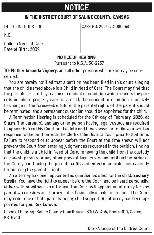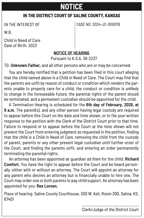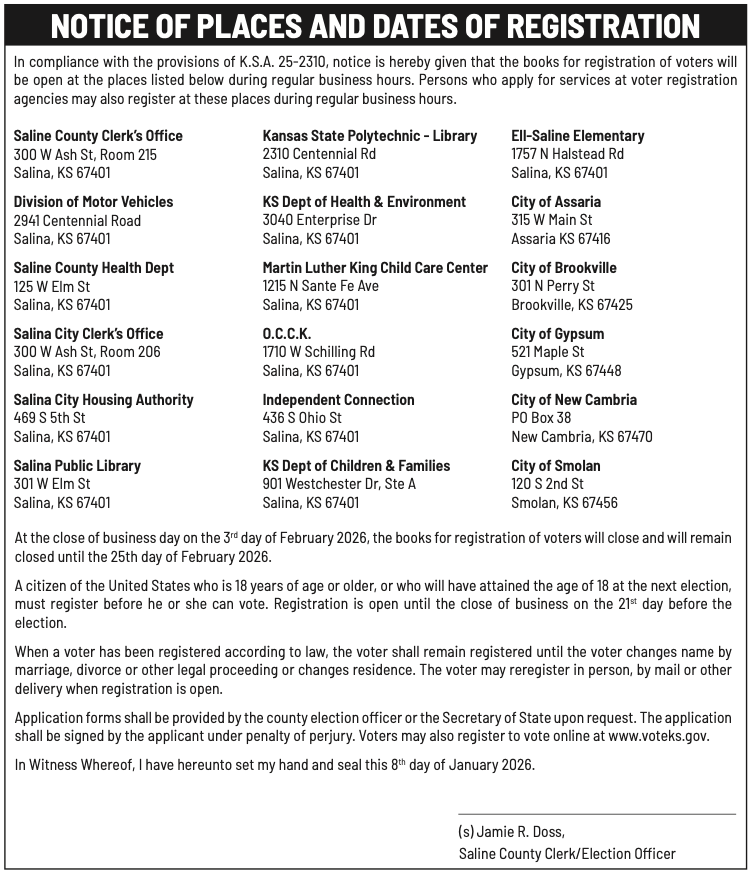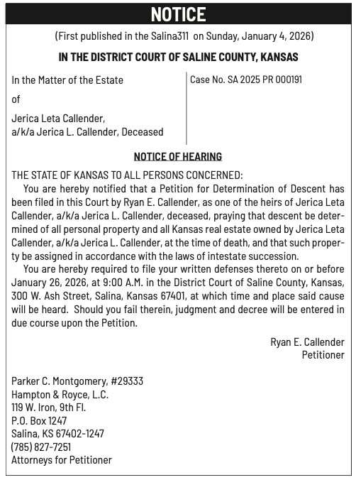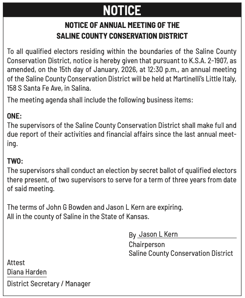 Public notices published in the Salina311 Newspaper on January 11th and/or January 7th.