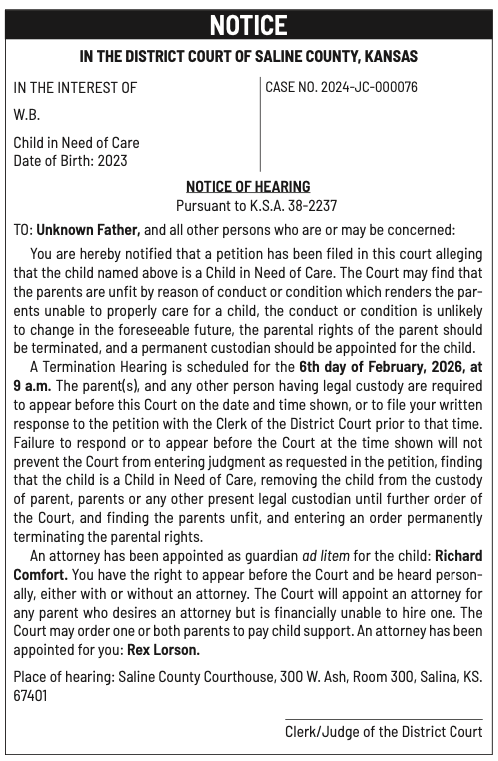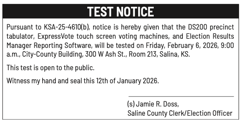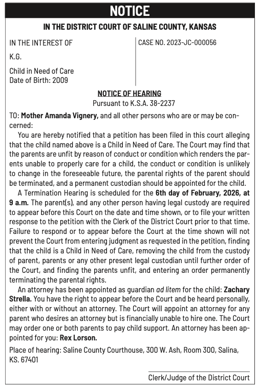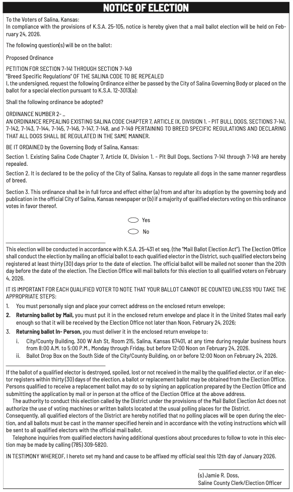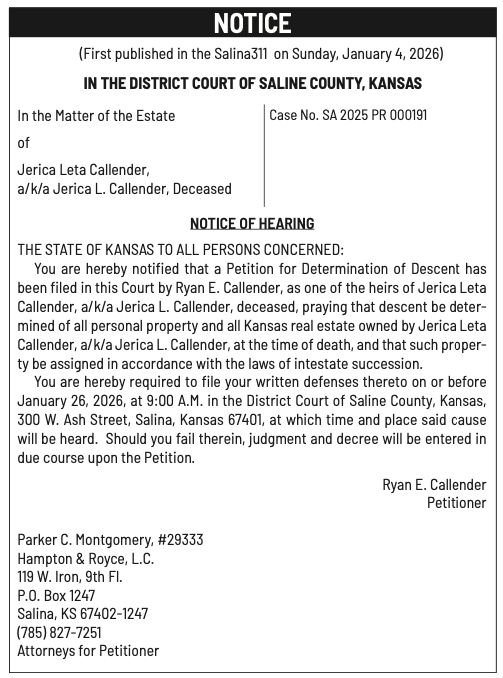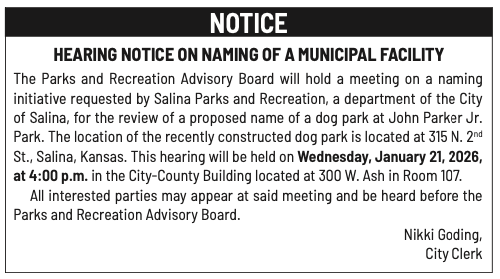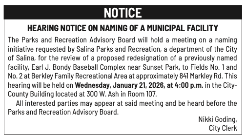 Public notices published in the Salina311 Newspaper on January 18th and/or January 14th.