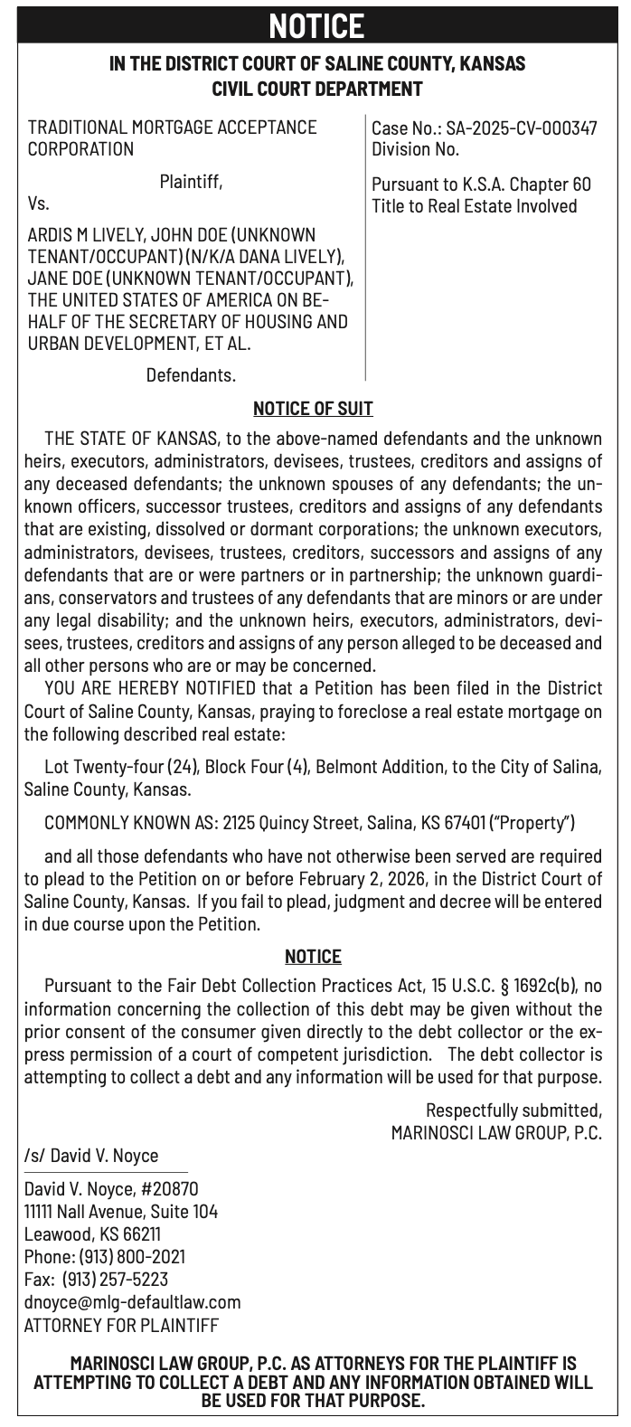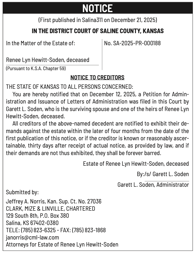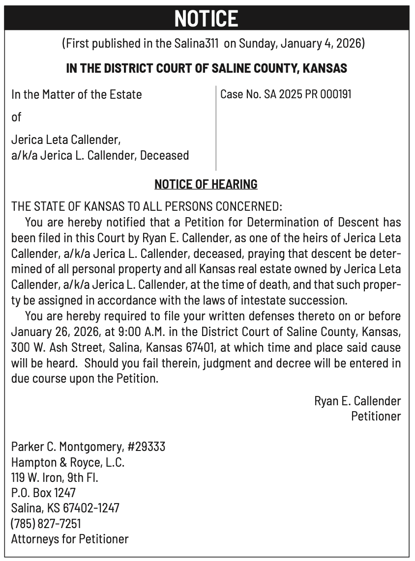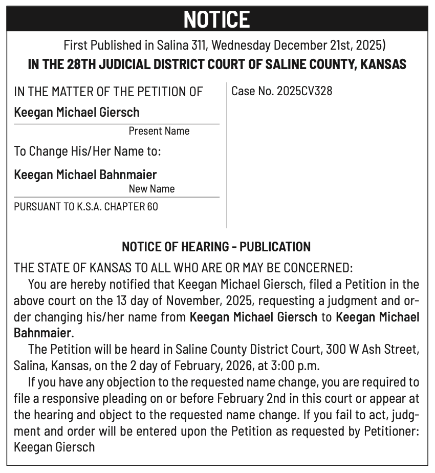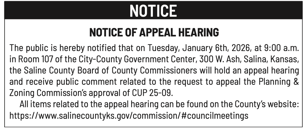 Public notices published in the Salina311 Newspaper on January 4th and/or December 31st.