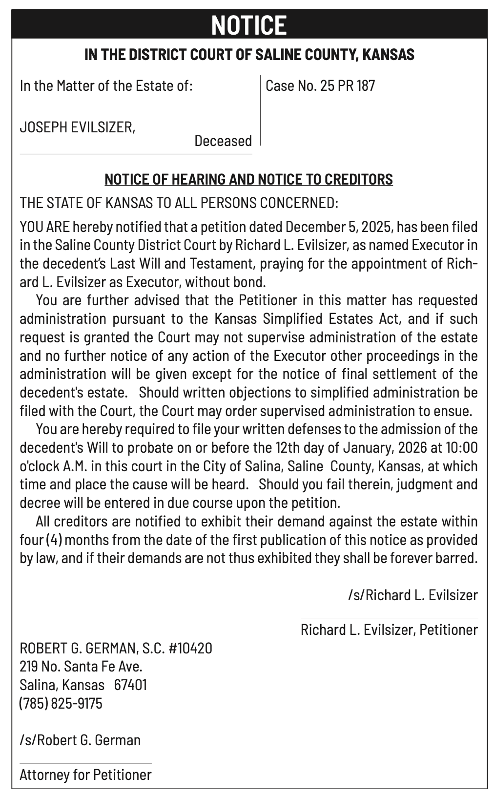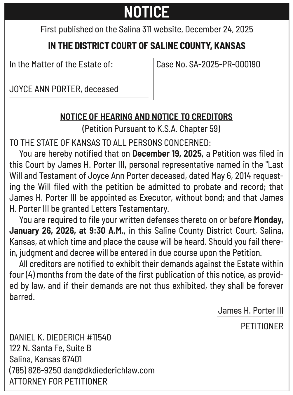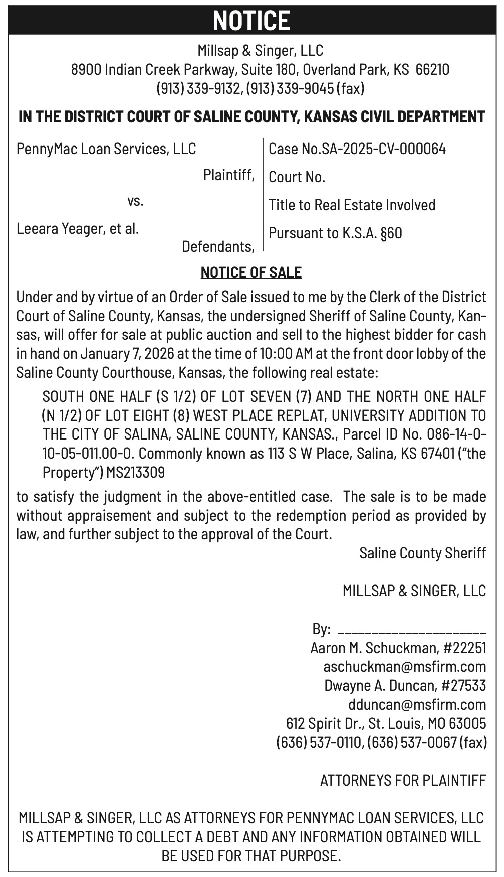 Public notices published in the Salina311 Newspaper on January 4th and/or December 31st.
