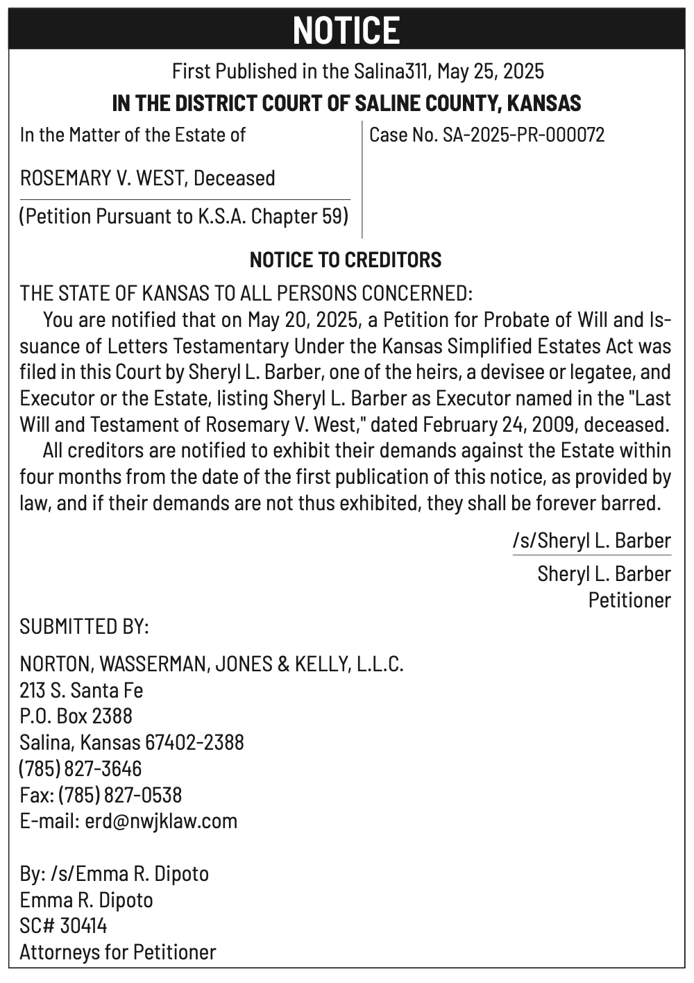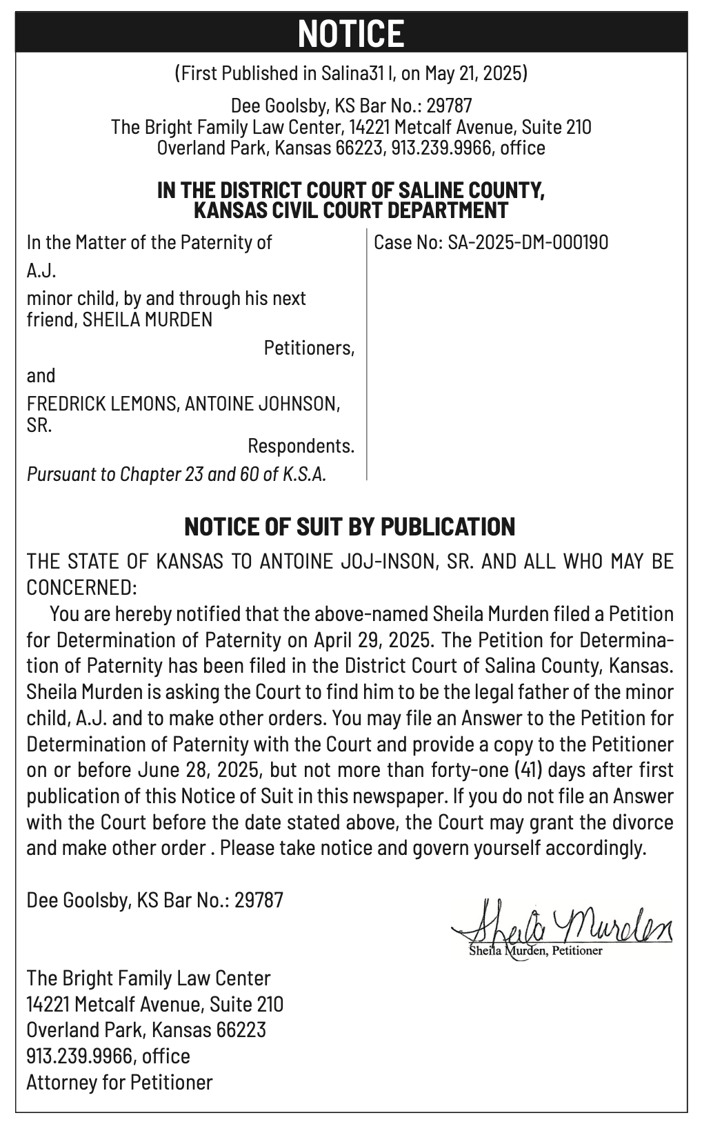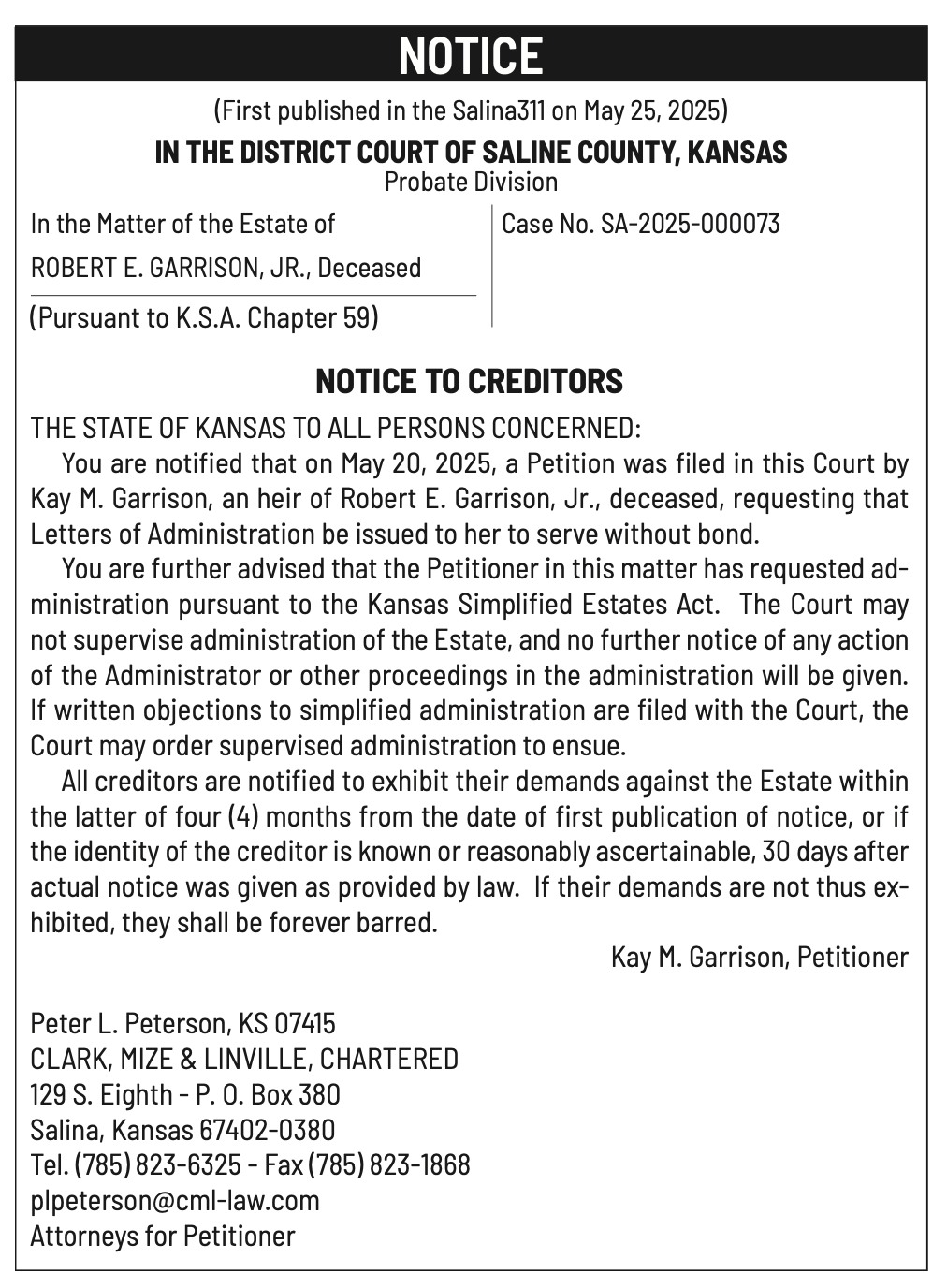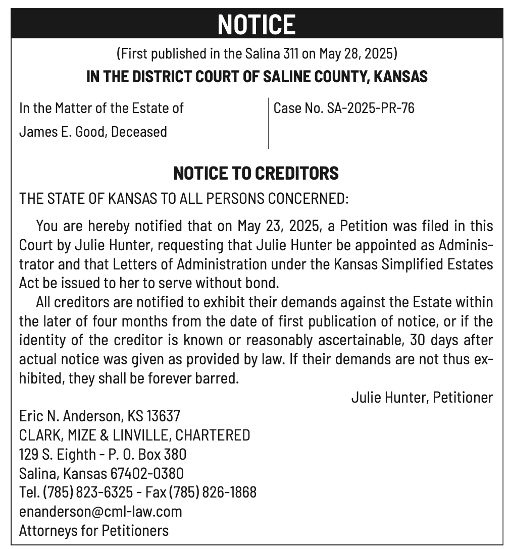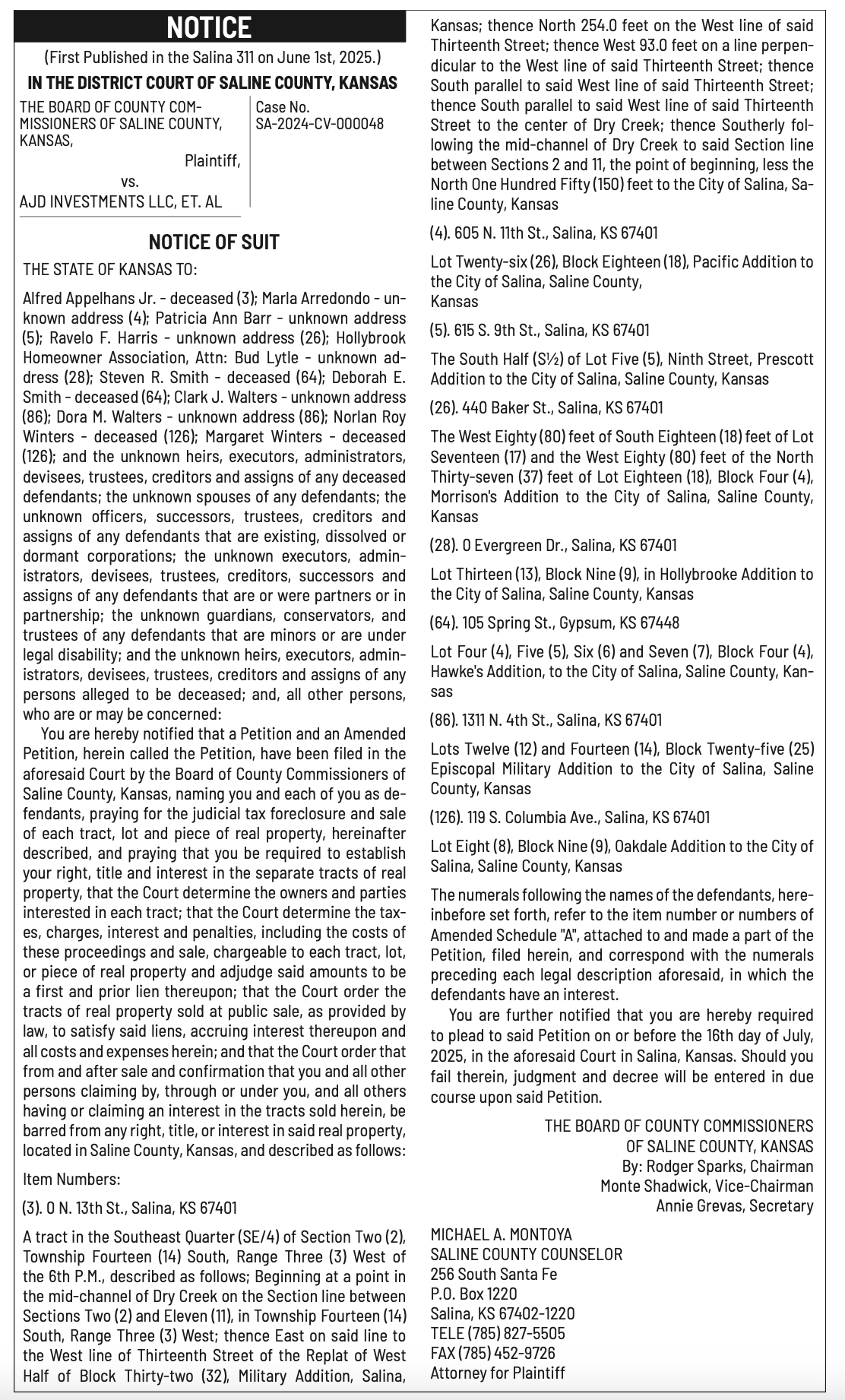 Public notices published in the Salina311 Newspaper on June 1 and/or May 28, 2025.