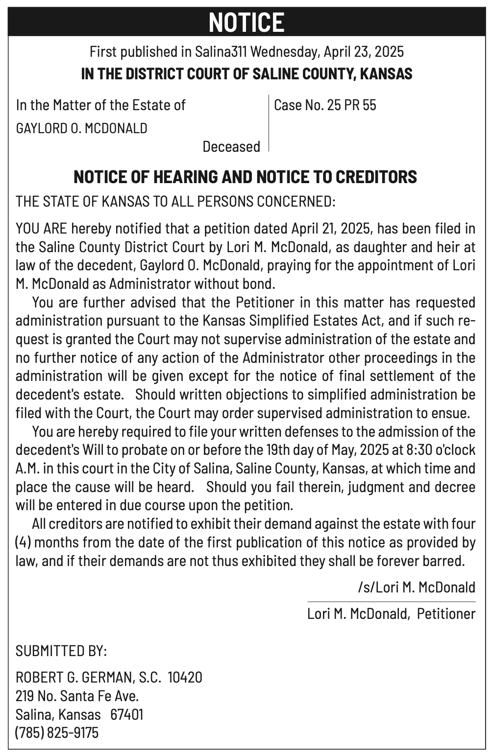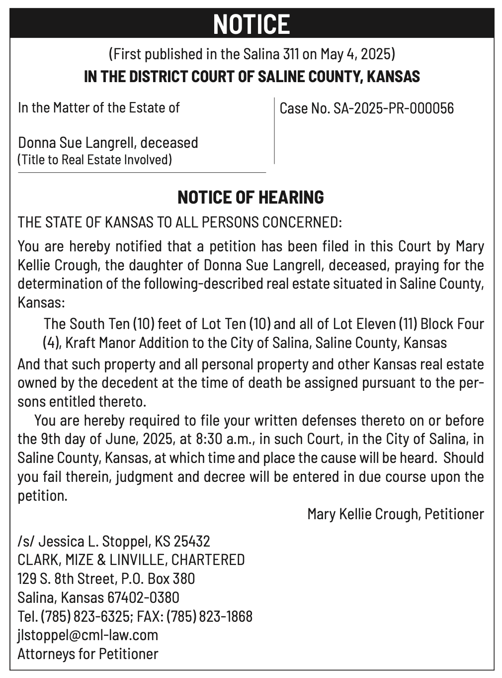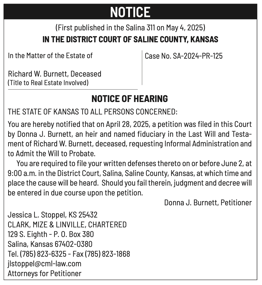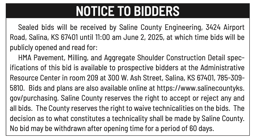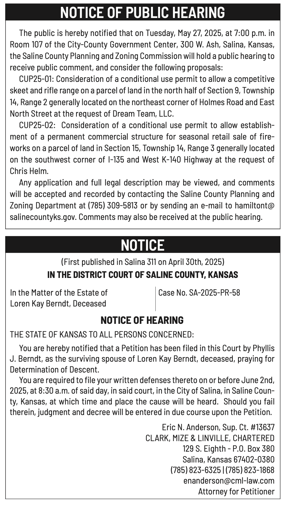 Public notices published in the Salina311 Newspaper on May 11th and/or May 7th.π‘This story was featured in the Salina311 Newspaper. Subscribe To The Paper