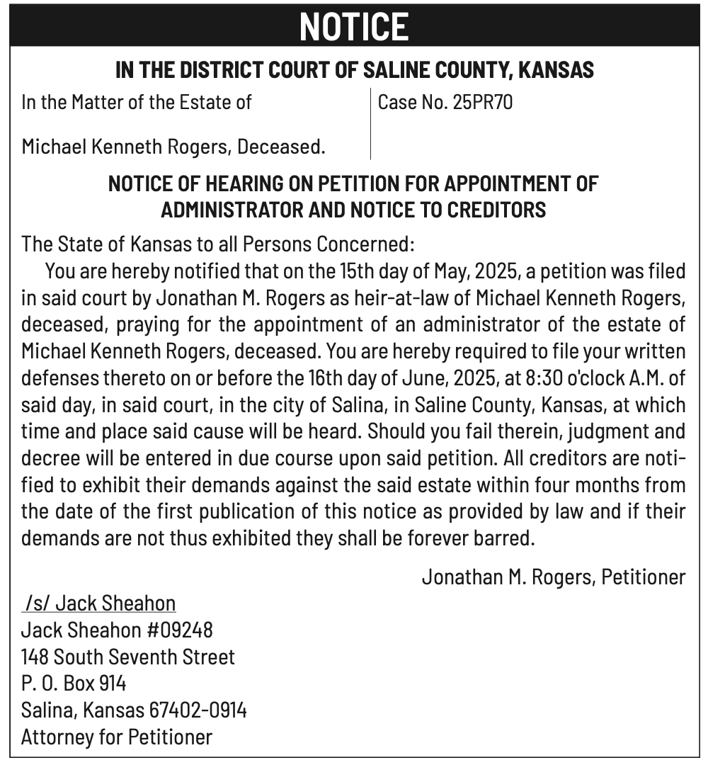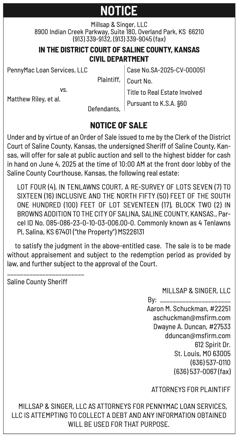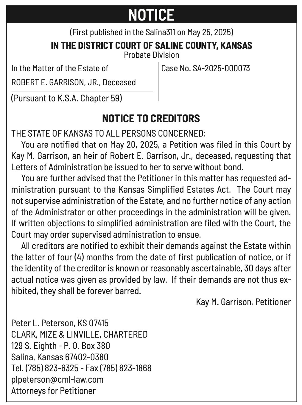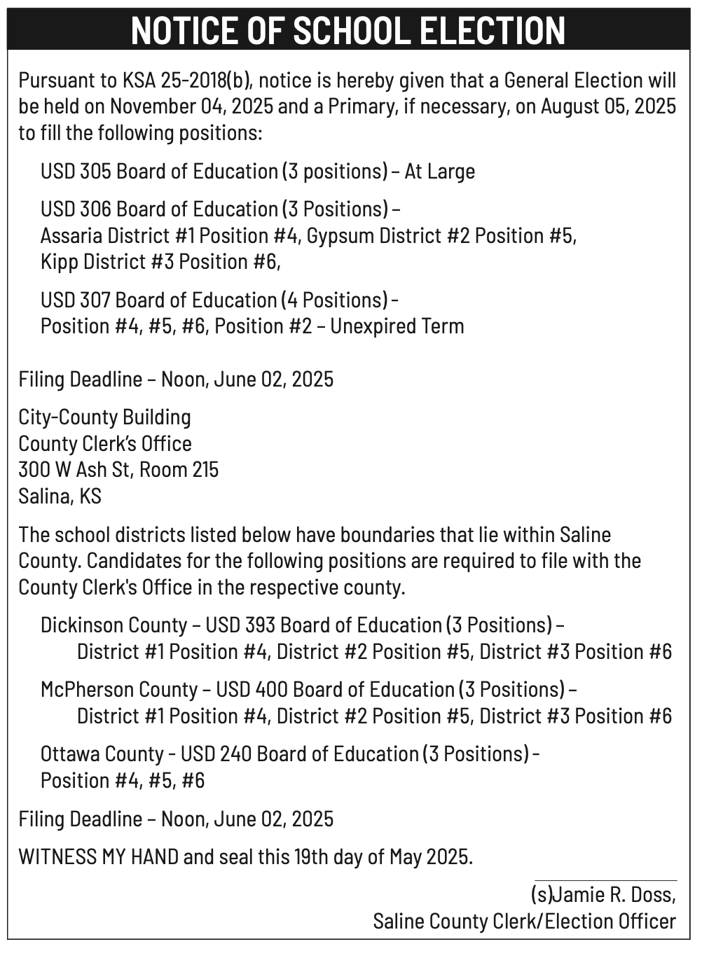 Public notices published in the Salina311 Newspaper on May 25th and/or May 21st.
