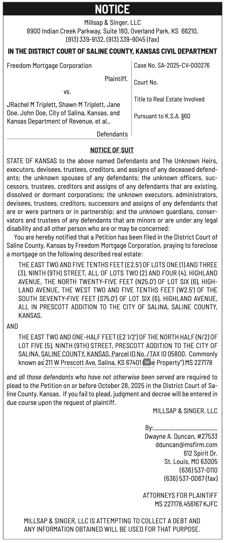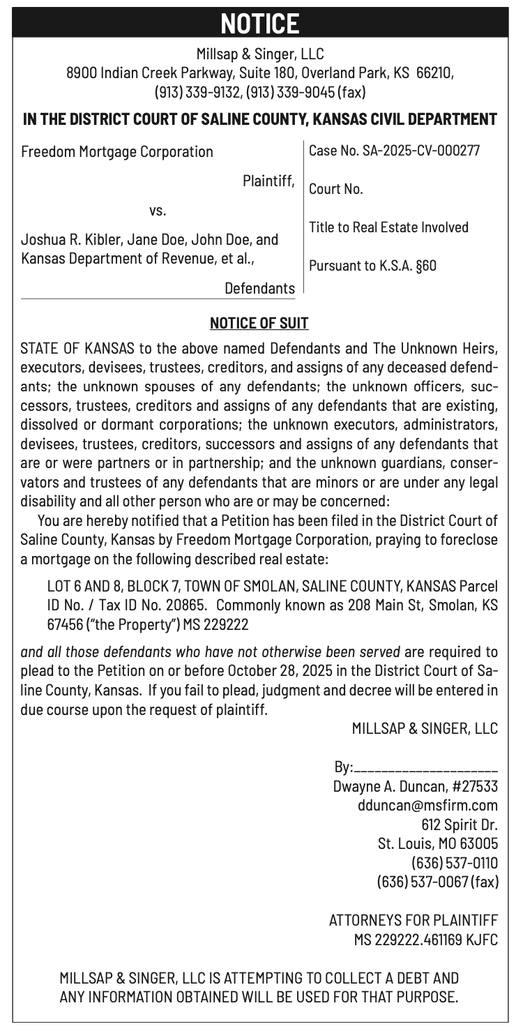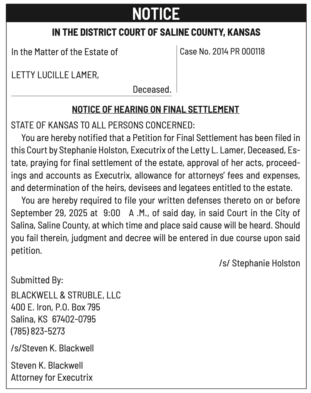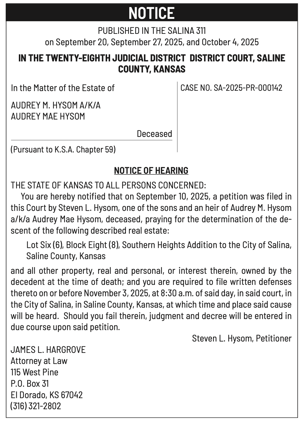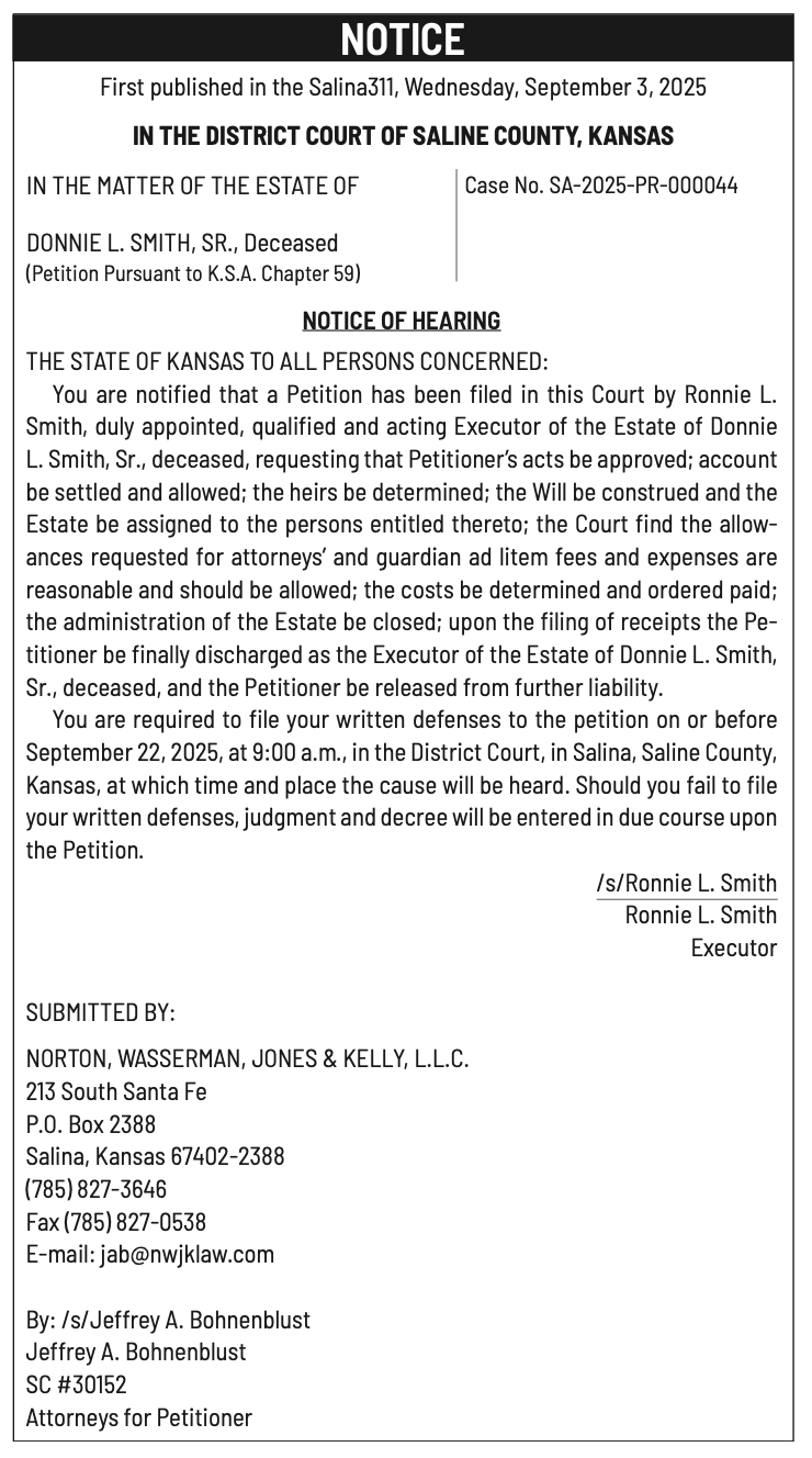 Public notices published in the Salina311 Newspaper on September 21st and/or September 17th.