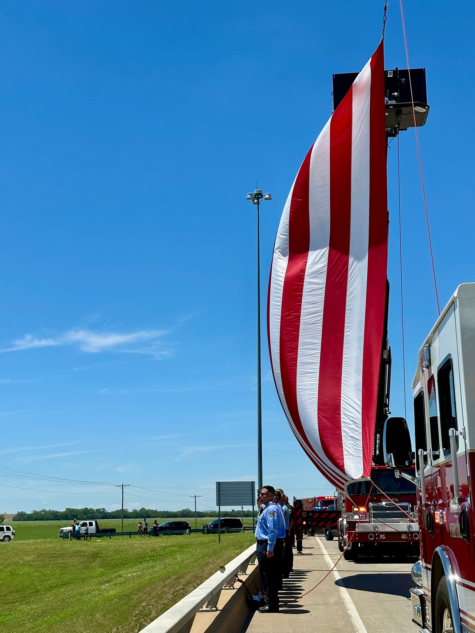 In Salina, firefighters and police officers gathered on the Crawford Street overpass, where they raised a large American flag and stood at attention as the procession passed beneath them. Citizens gathered nearby on the Magnolia overpass, on exit ramps, and on roadside shoulders—many holding flags, all standing silently in honor of a life lost too soon.