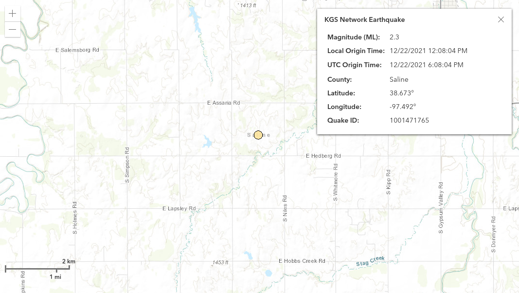 The Kansas Geological Survey, or KGS, recorded an earthquake this morning at 1:25 am. The tremor was a 2.3, centered near E Assaria Rd and S Cunningham Rd.