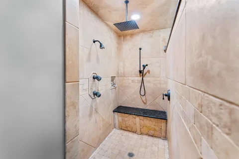 Inside, the home blends classic character with modern comfort: a renovated kitchen with island, pantry, and new appliances flows into a vaulted living room centered around a dramatic stone fireplace. The primary suite sits on the main floor and feels like its own retreat, featuring dual sinks, a tiled walk-in shower, a walk-in closet, and a private sauna.