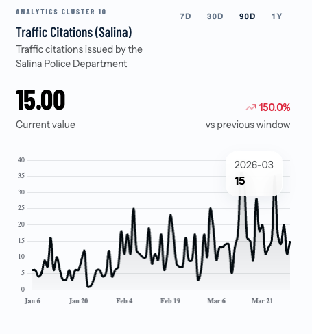 Traffic citations issued in Salina continued to run at an elevated pace through the final week of March, with the week of March 23–30 averaging 18.1 citations per day. That figure is 11% above the prior week and 39.9% higher than February's daily average of 12.0 citations.