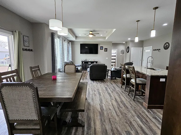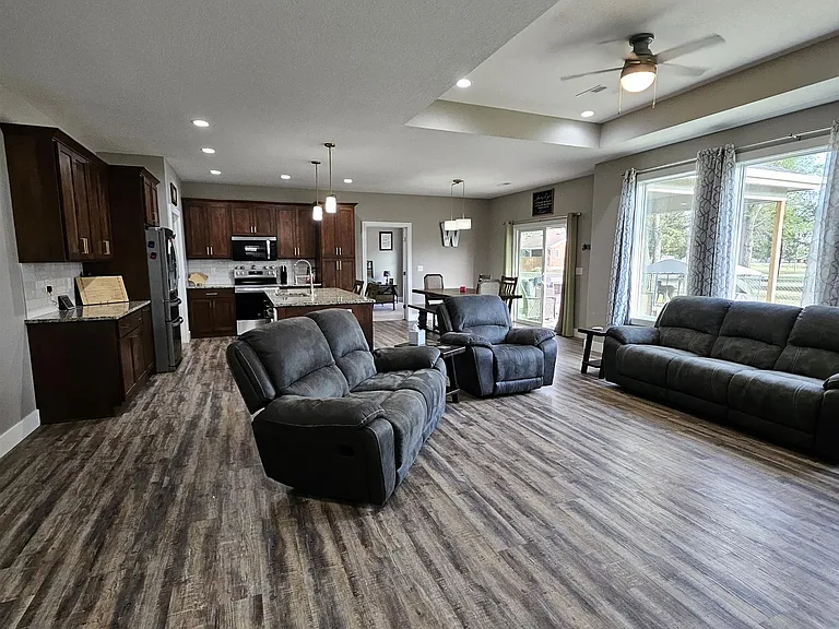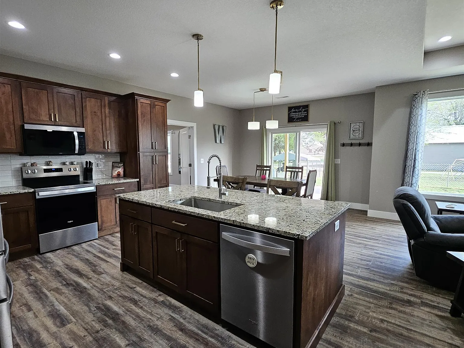 The home features a three-car garage and an open floor plan with an eat-in bar connecting the kitchen and main living space. According to the listing, the kitchen includes custom-built cabinets with soft-closing drawers, a double pull-out trash system, and stainless steel appliances, including a dishwasher, microwave, and oven/range.